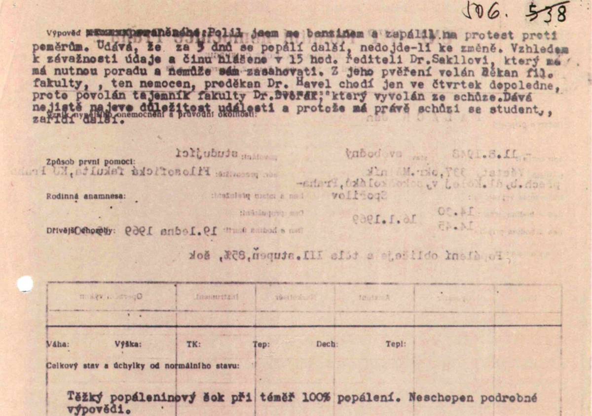 Přepis zaznamenaného rozhovoru MUDr. Zdenky Kmuníčkové a těžce popáleného Jana Palacha během jeho hospitalizace v nemocnici v Legerově ulici v Praze.