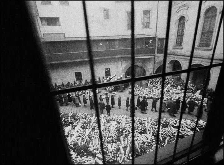 Pohled oknem v prvním patře pražského Karolina na nádvoří, kde se lidé přicházeli poklonit památce zesnulého Jana Palacha.