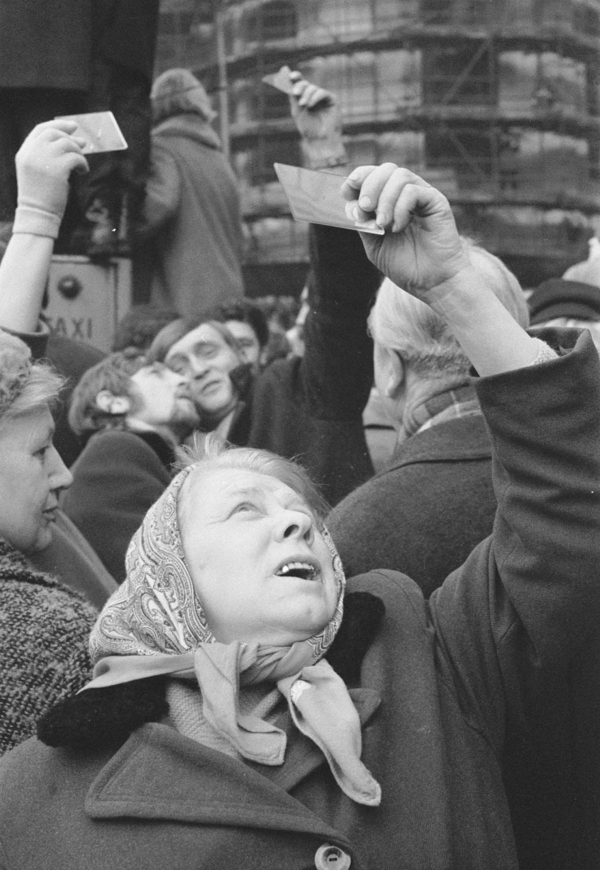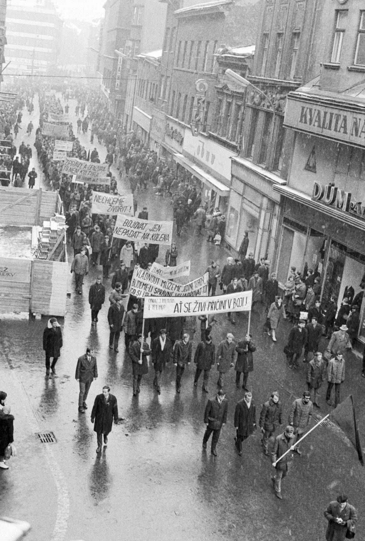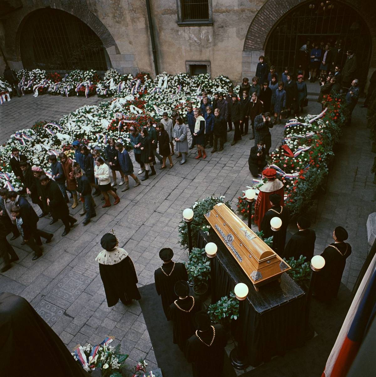 Na poslední cestě doprovázely Jana Palacha tisíce občanů, na snímku z 25. ledna 1969 je zobrazen pohřební průvod na Staroměstském náměstí.