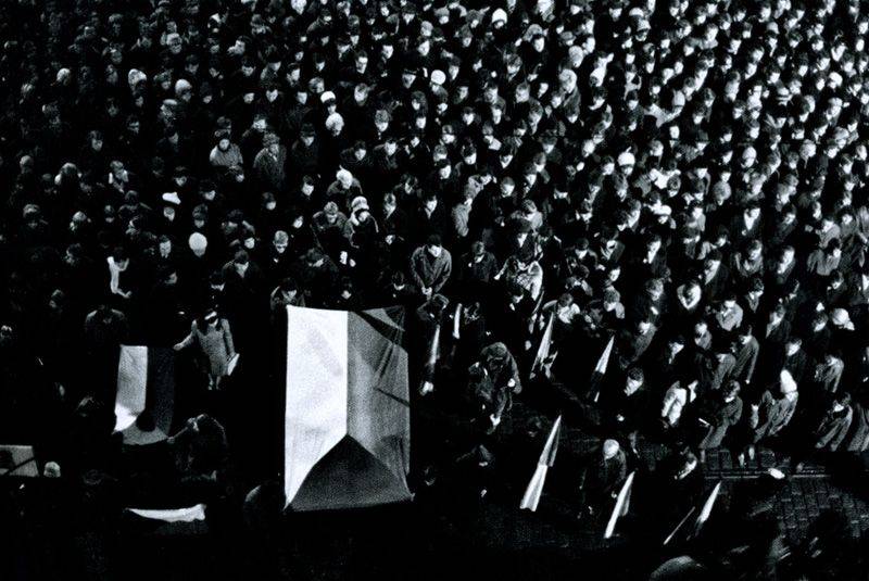 Smuteční průvod po smrti Jana Palacha, na němž bylo náměstí Krasnoarmějců před Filozofickou fakultou spontánně přejmenováno na Palachovo náměstí.