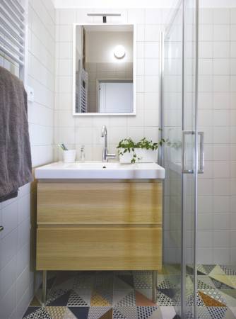 Stejné kachličky jako v kuchyni se uplatnily také v koupelně.