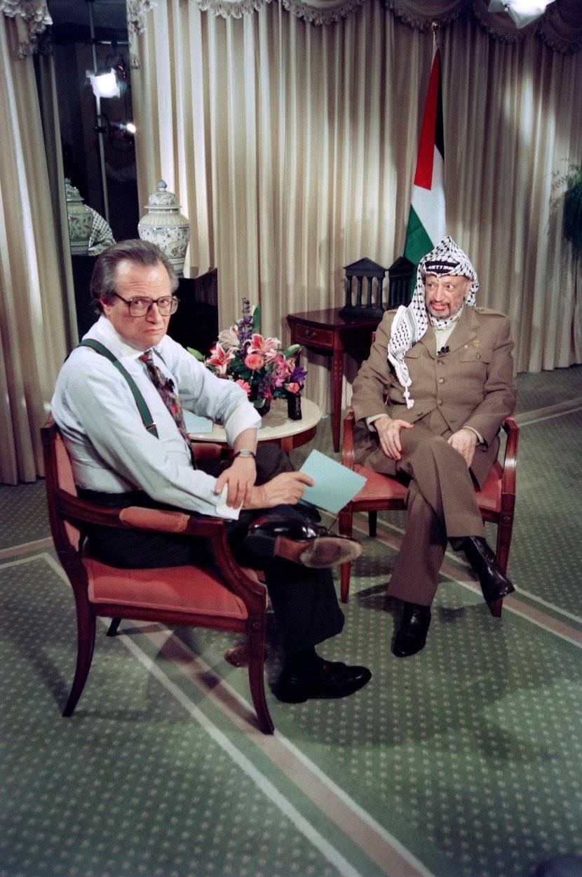 Na židli proti Kingovi se ocitla řada celebrit, státníků, vědců, podnikatelů, ale i autorů konspiračních teoriích. Na snímku je s palestinským politikem Jásirem Arafatem při rozhovoru v roce 1993.