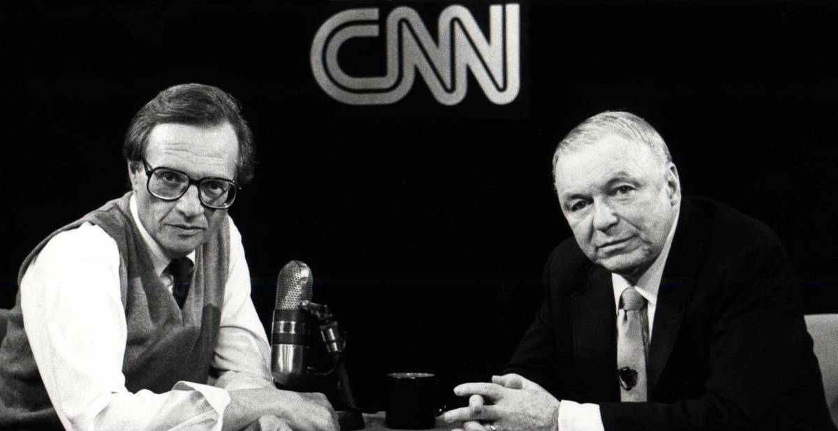 V červnu 1985 začala na americké televizní stanici Kingova talkshow Larry King Live. Díky svému nekonfrontačnímu přístupu a jednoduchým otázkám s otevřeným koncem se stal oblíbeným moderátorem osobností ze všech sfér veřejného života. Na snímku s Frankem Sinatrou v roce 1988.