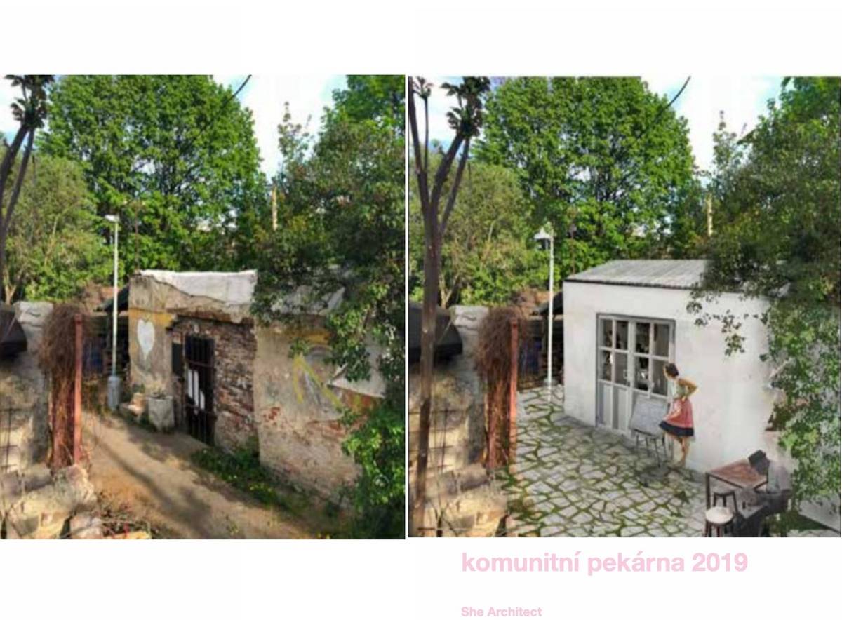 Tohle bývala buďánkovská truhlárna (vlevo), teď z ní má vzniknout komunitní pekárna (vizualizace vpravo).