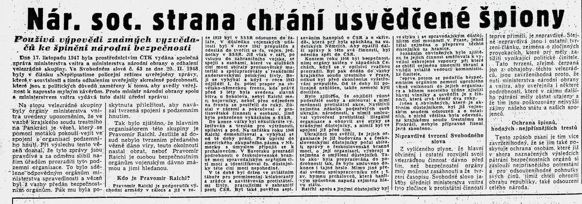 Svobodné slovo 4. března 1948. Pravomil Raichl je v článku uveden jako agent cizí zpravodajské služby.