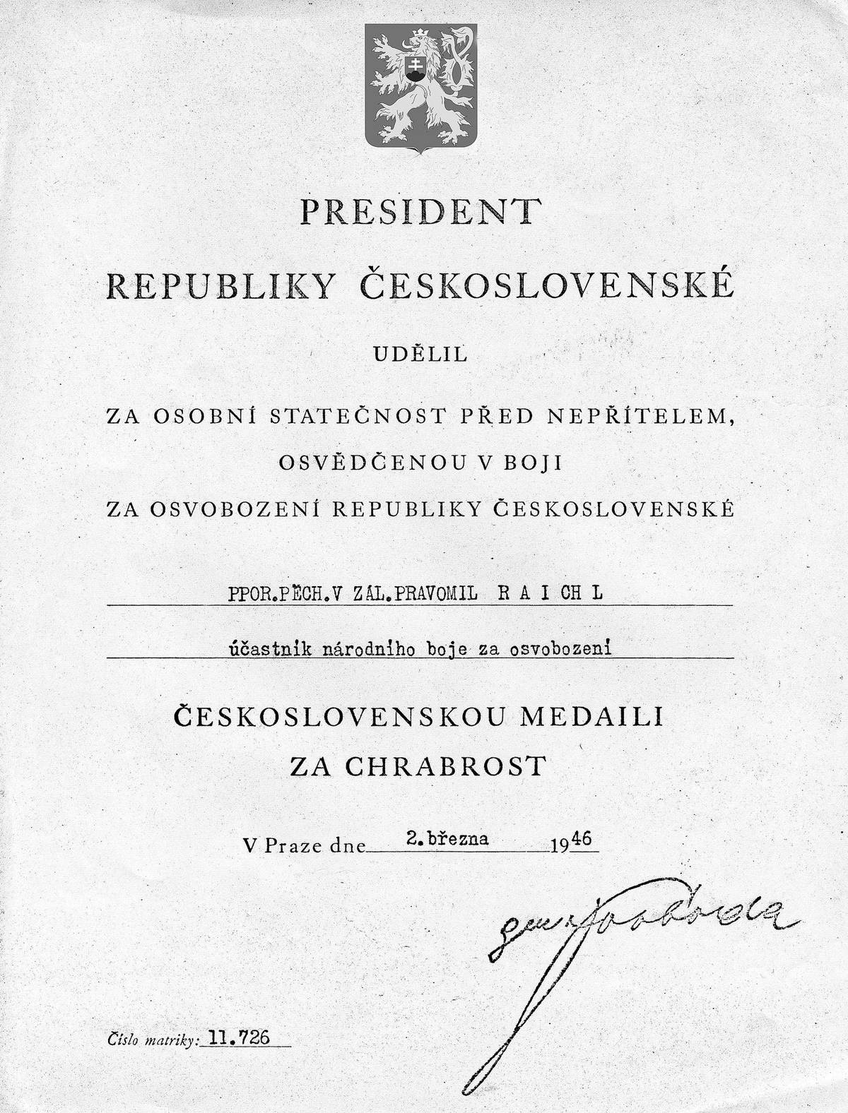 Dekret Čs. medaile Za chrabrost z 2. března 1946, signovaný generálem Ludvíkem Svobodou. Ten samý Svoboda bude ovšem v únoru 1948 o Raichlovi tvrdit, že se vyhýbal nasazení na frontě.