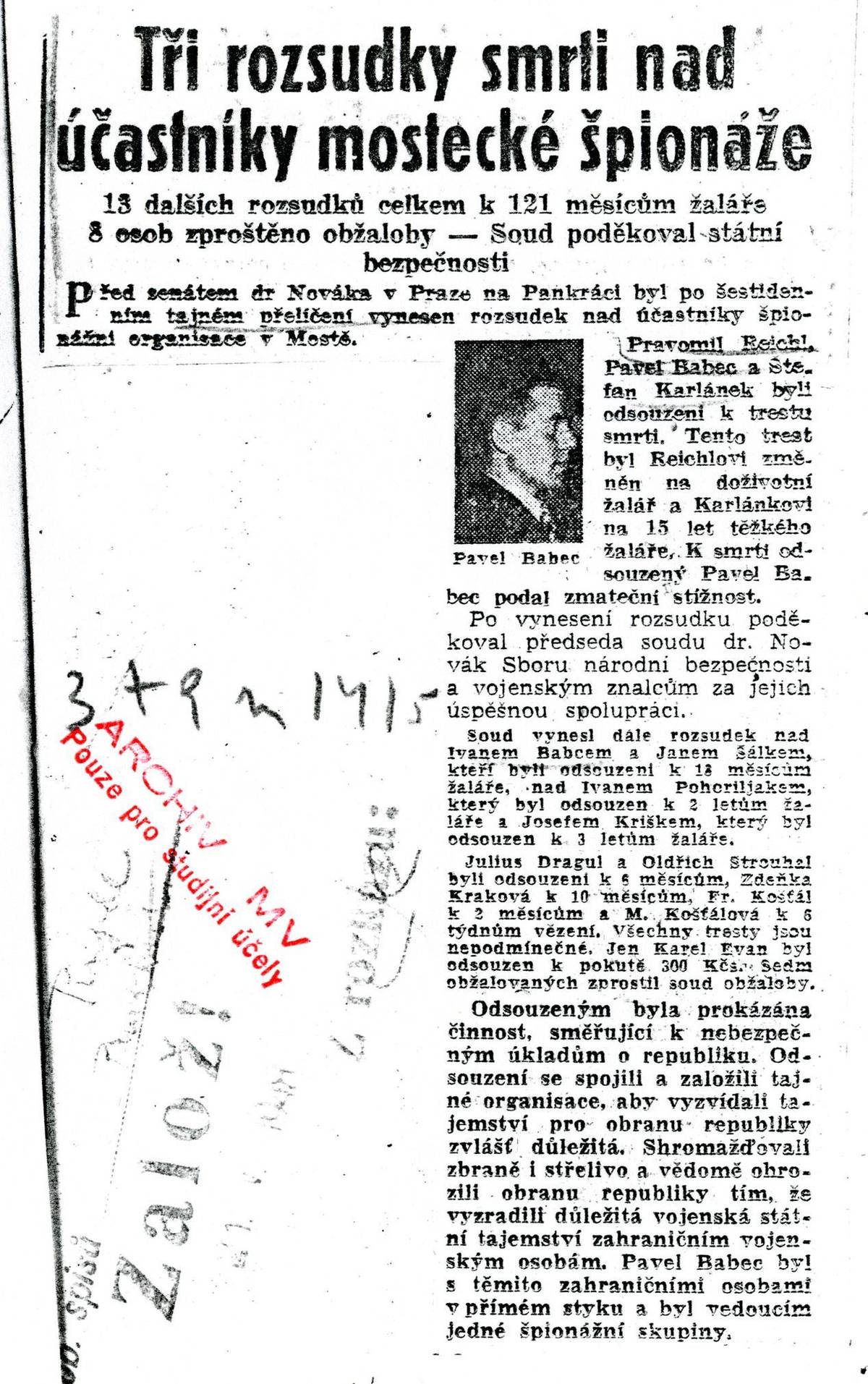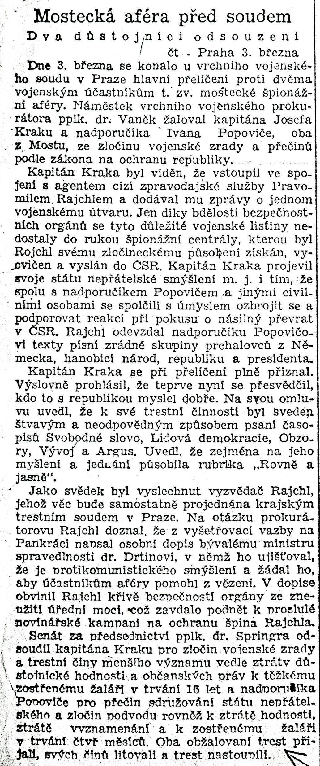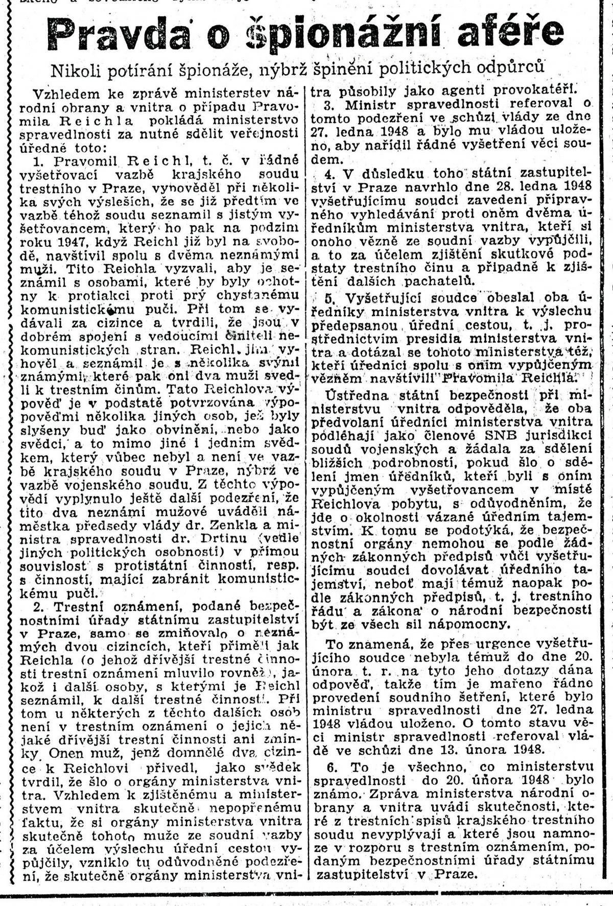 Svobodné slovo píše 23. února 1948 o Mostecké špionážní aféře. Komunistickému převratu v únoru 1948 předcházela dlouho připravovaná provokace. Vyústila v zatýkání a mučení desítek vojáků, bývalých partyzánů, ale také ideových či jen potenciálních názorových odpůrců. Jedním z nejvíce dehonestovaných "buržoazních reakcionářů" se stal Pravomil Raichl.