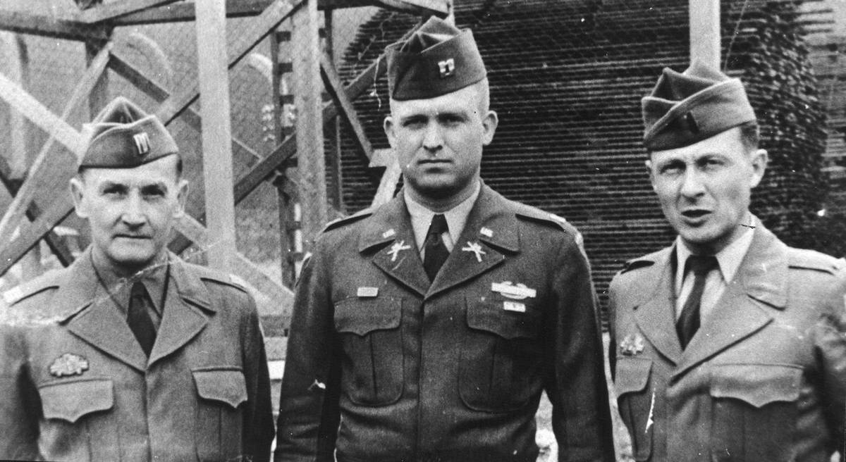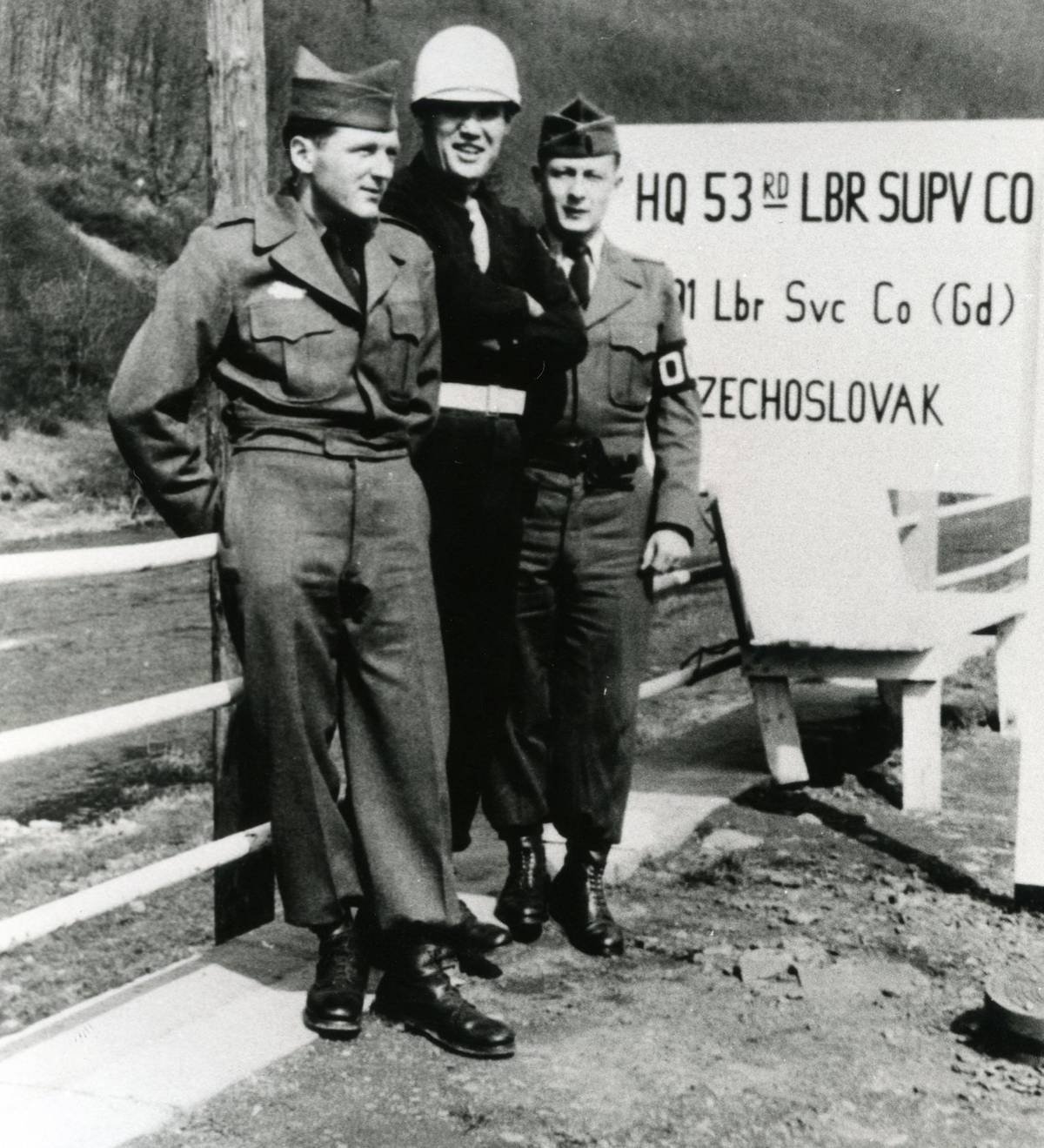 Rok 1954, před kasárnami u řeky Nahe u Nahbollenbachu. Zleva Vojtěch Knopp, Jaroslav Potyka a Pravomil Raichl. Nejdříve používali černé americké uniformy, později šedomodré jako letci a nakonec olivově zelené stejnokroje.
