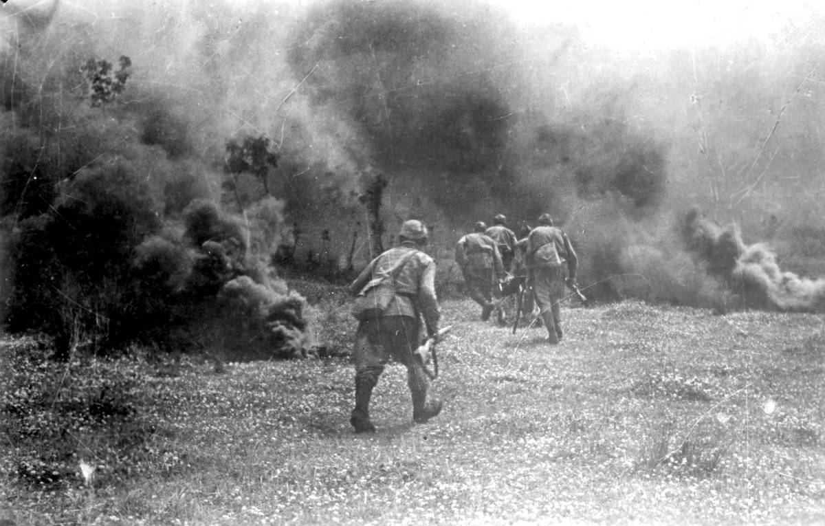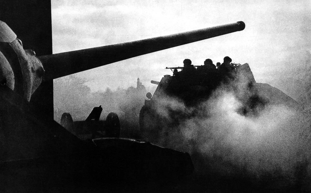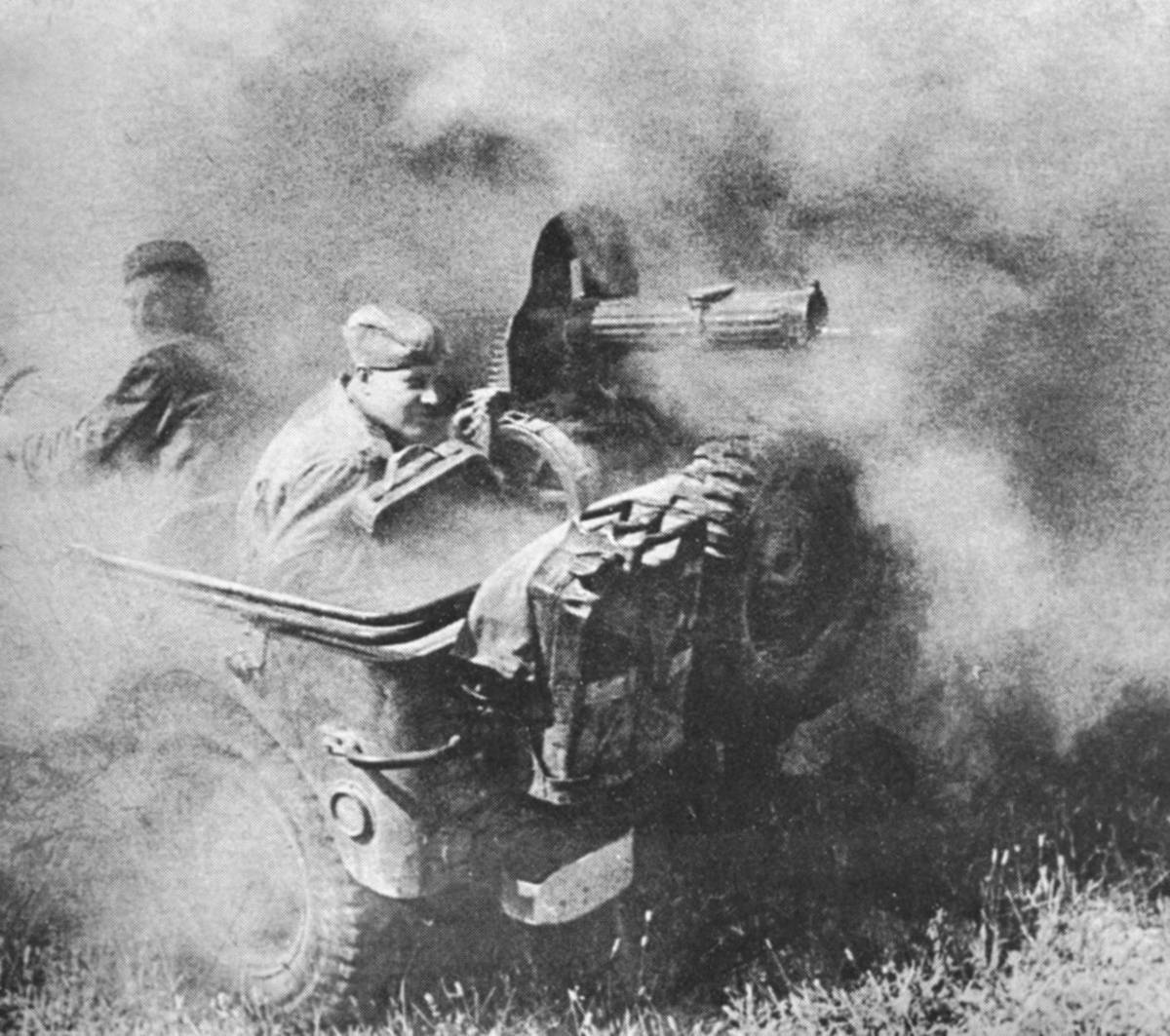 Přemísťování těžkého kulometu pod dýmovou clonou. Pěchota, postupující souběžně s tanky, vyhání nepřítele z jeho postavení. Od konce září 1943 dosáhly sovětské divize a armádní sbory levého břehu Dněpru. Bitva o ukrajinské hlavní město Kyjev začala 3. listopadu 1943.