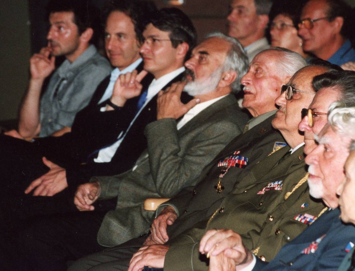 Divadlo ABC v Praze, 10. června 2001 - koncert skupiny Taxmeni u příležitosti devadesátých narozenin generála Františka Fajtla. Zleva tvůrci filmu Tmavomodrý svět herec Ondřej Vetchý, britský filmový producent Eric Abraham, režisér Jan Svěrák a scenárista Zdeněk Svěrák. Dále váleční veteráni Pravomil Raichl, Václav Straka, František Špaček a oslavenec František Fajtl. Pravomil Raichl se podle všeho už v té době zabýval způsobem likvidace někdejšího komunistického prokurátora Karla Vaše, kterou naplánoval na výročí komunistického puče 25. února 2002. Za necelých osm měsíců ale právě v ten den ho stihne smrtelný infarkt myokardu.