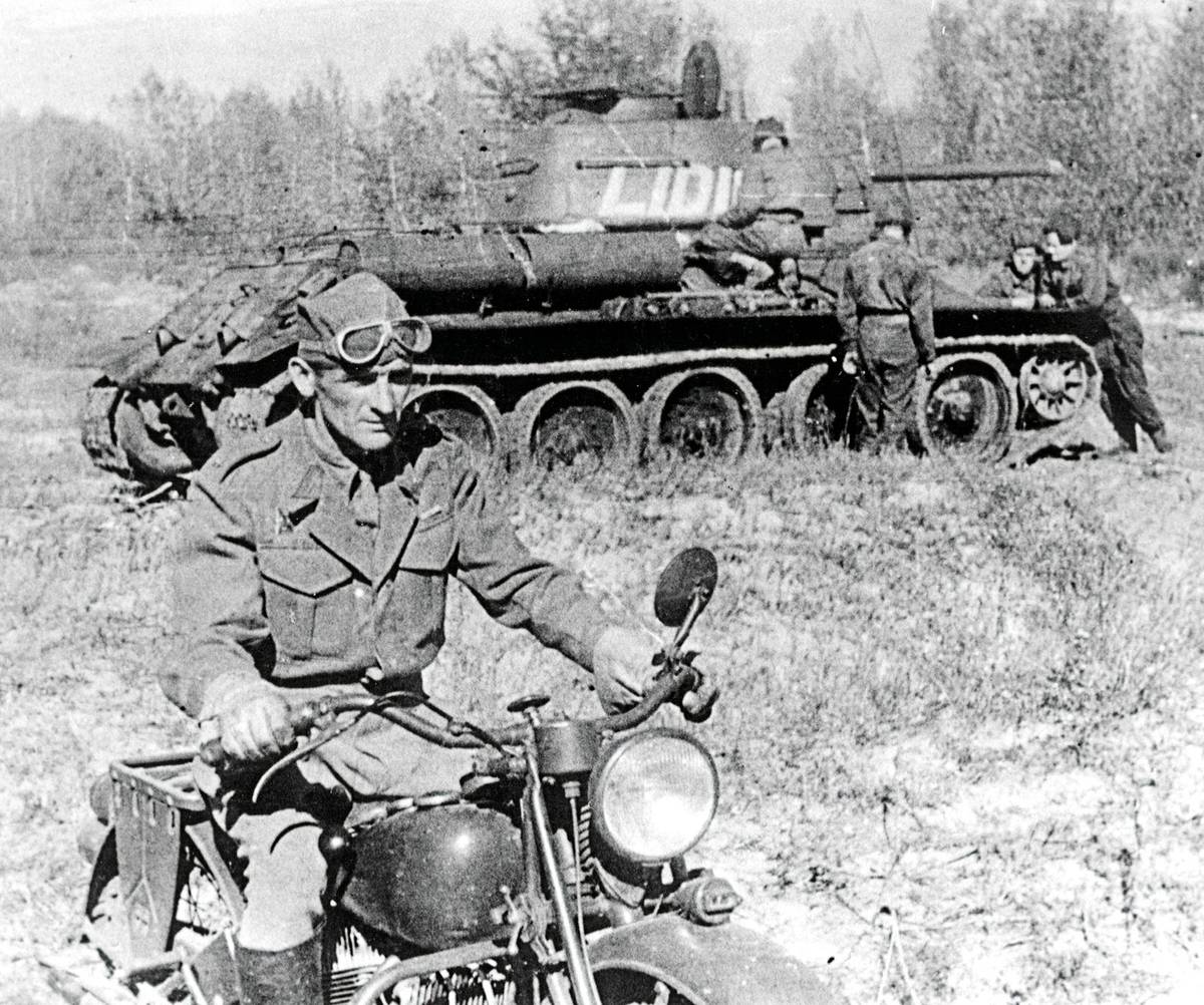 Rok 1943 (pravděpodobně Novochopersk). Na motocyklu sedí Josef Buršík, kterému vojáci přezdívají kvůli nosu Datel. Za hrdinství v bitvě o Kyjev byl vyznamenán Zlatou hvězdou Hrdiny SSSR. Do centra Kyjeva pronikl mezi prvními i samopalník Pravomil Raichl. V pozadí tank T-34/76 s bojovým nápisem LIDICE. Za několik týdnů vyrazí na frontu ke Kyjevu.