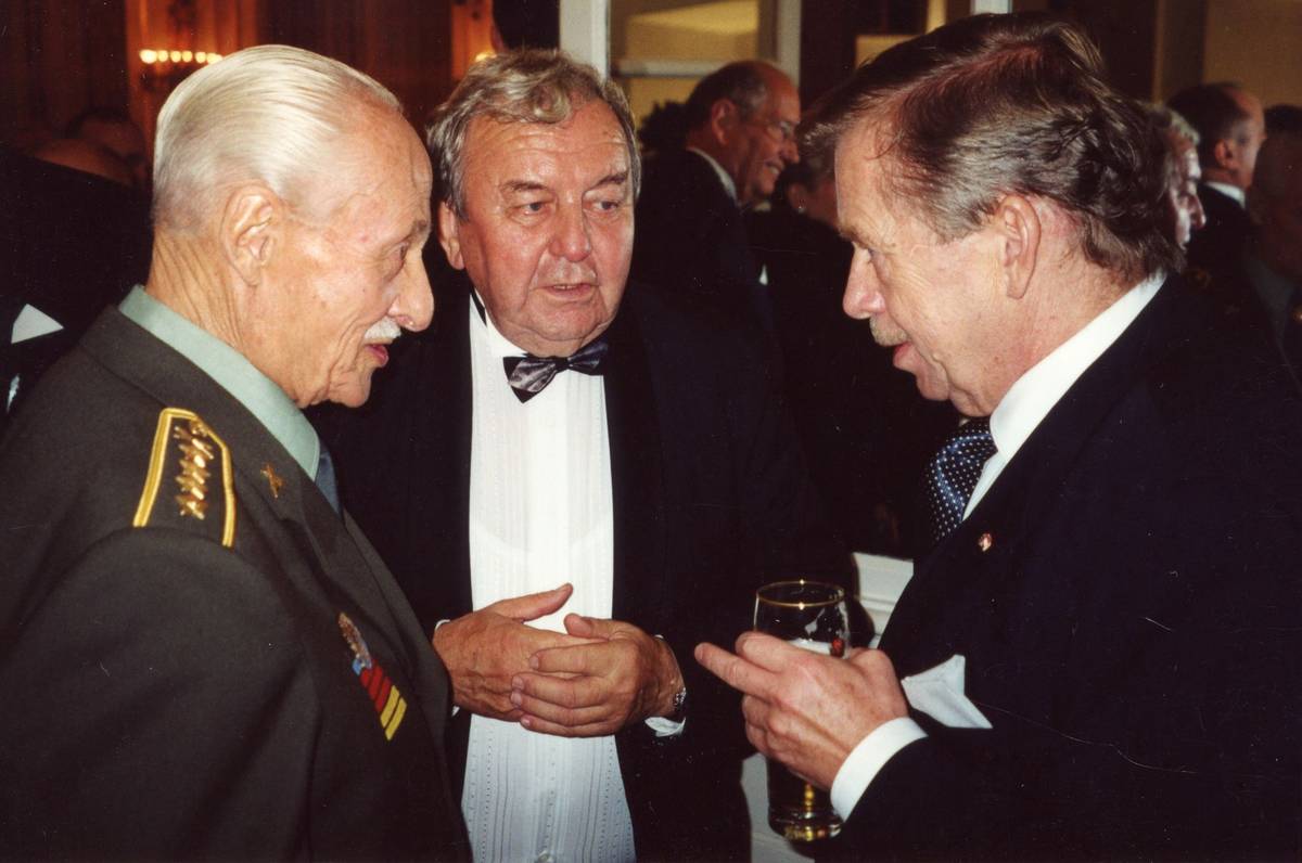 Významný okamžik přichází 28. října 2000. Prezident republiky Václav Havel udělil Pravomilu Raichlovi Řád Bílého lva vojenské skupiny. Raichl (vlevo) po oficiálním ceremoniálu s prezidentem Havlem a poslancem (někdejším hokejovým reprezentantem a trenérem) Augustinem Bubníkem.