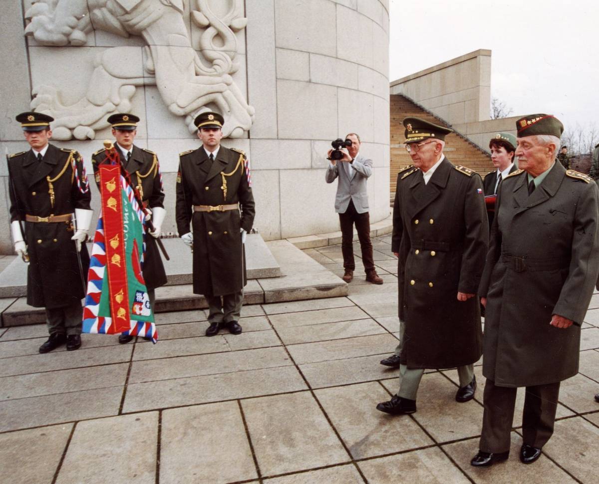 Národní památník na Vítkově, 9. února 2001. Bývalý tankista Čs. obrněné brigády ve Velké Británii generál Gustav Svoboda a Pravomil Raichl přidávají praporové stuhy ČSOL na standartu 6. zabezpečovací brigády – Útvaru Pražského povstání.
