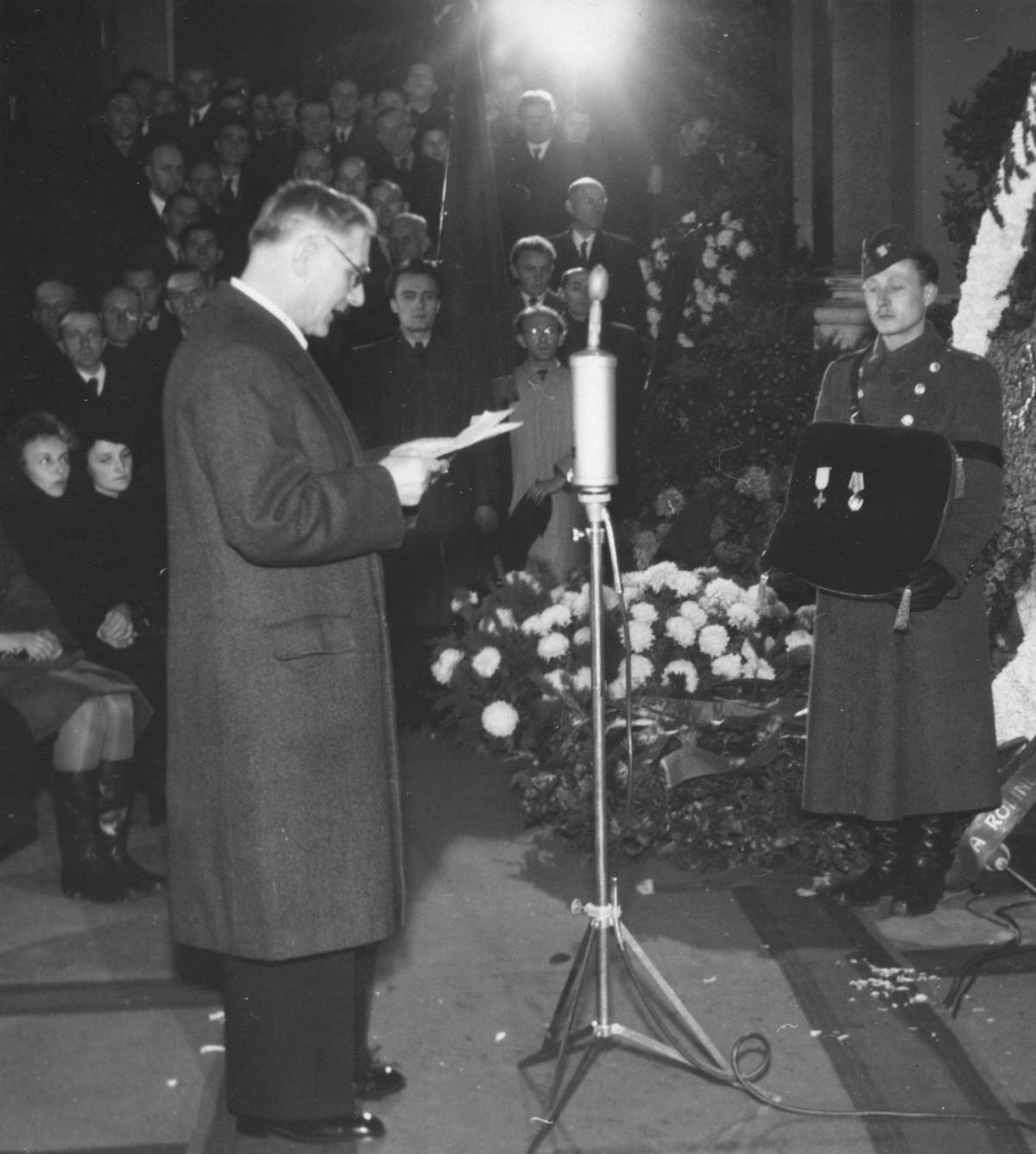 Národní muzeum v Praze v listopadu 1945. Smuteční akt za Jana Švermu, komunistického politika, který o rok dříve zemřel. Černou sametovou podušku s Čs. válečným křížem 1939 a Leninovým řádem drží Pravomil Raichl. Před objektivy fotoaparátů vzadu v brýlích a světlém plášti přihlíží Karel Vaš. Nebylo a nebude to poprvé, kdy se zkříží cesty válečného hrdiny Raichla a fanatického komunisty Vaše.