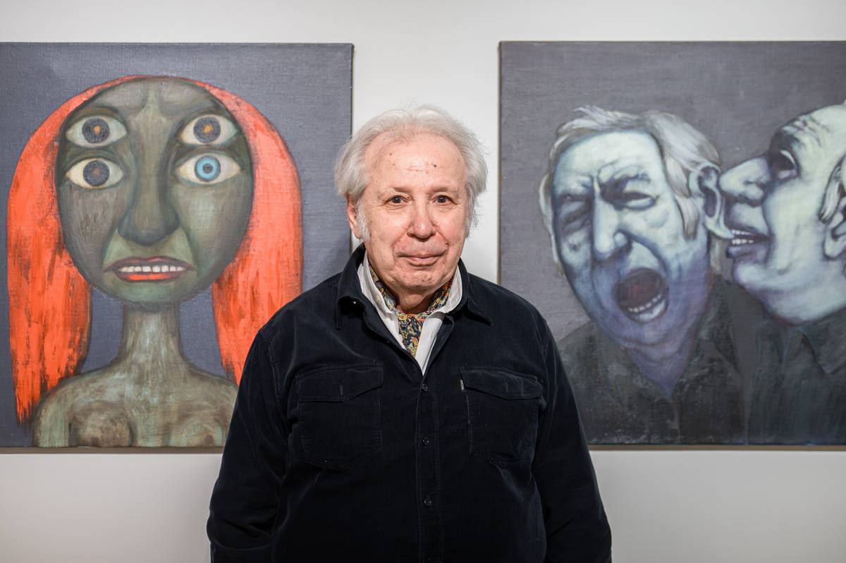 Na fotografii z výstavy Metafyzika a zoufalství, která v pražském Centru současného umění DOX potrvá do 5. října, jsou Viktor Pivovarov a jeho dcera, kurátorka Máša Pivovarová, před obrazem nazvaným Zrcátko.