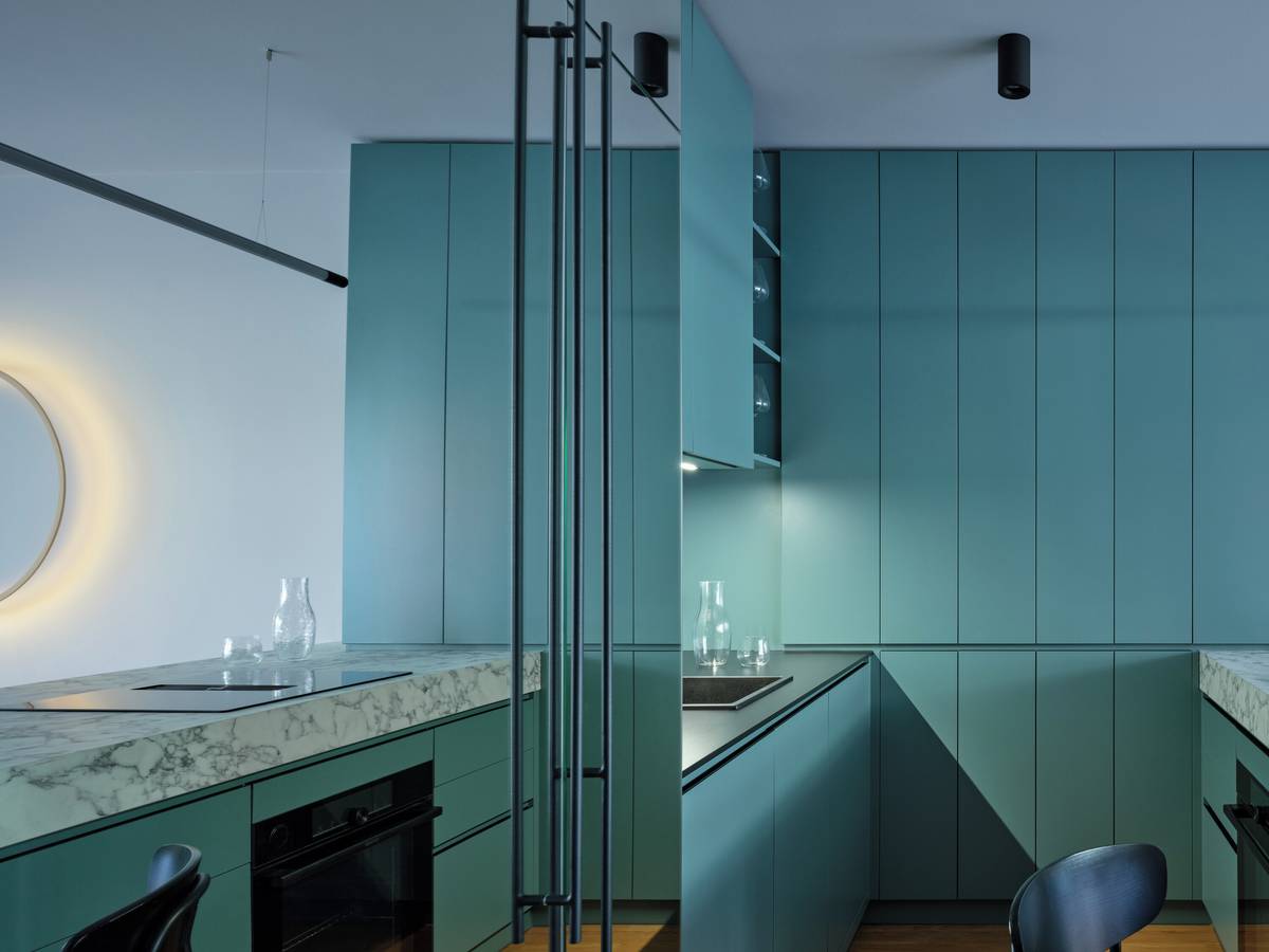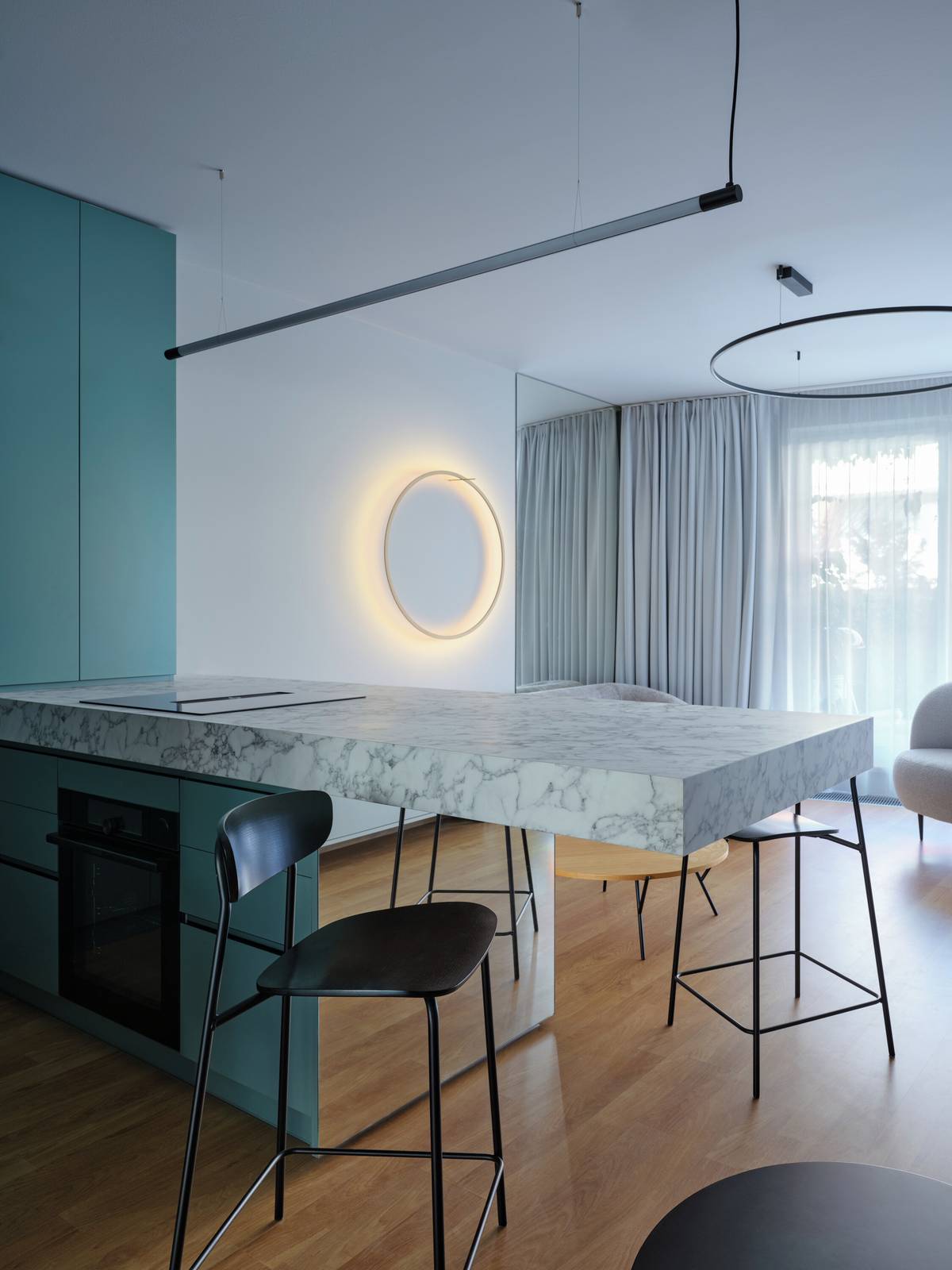 Atmosféru bytu výraznou měrou vytváří epoxidová stěrka, jejíž barva přechází od světle šedé k petrolejové.