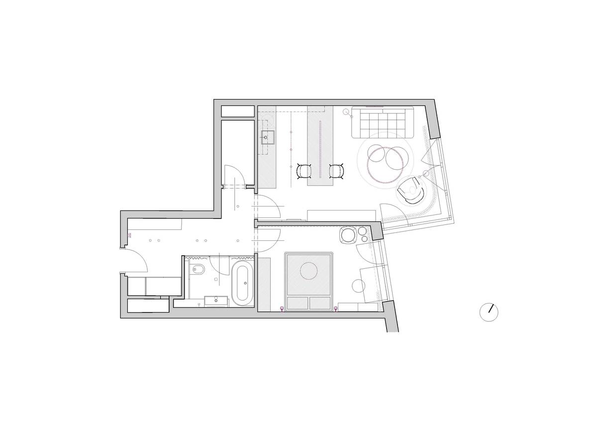 Světlosti bytu pomohlo nahrazení zdi prosklenou příčkou. Ta odděluje koupelnu od vstupní chodby.
