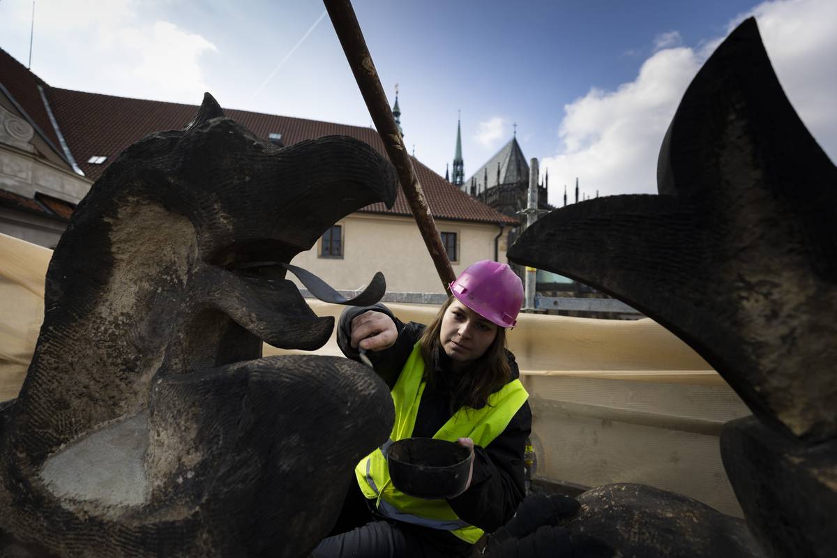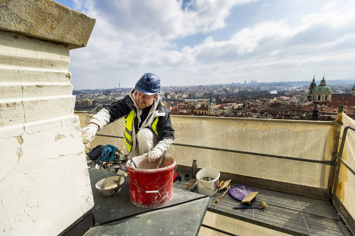 Restaurátoři také opravují pískovcovou plastiku nad otevřenou sloupovou halou u hlavního vchodu (tzv. portiko).