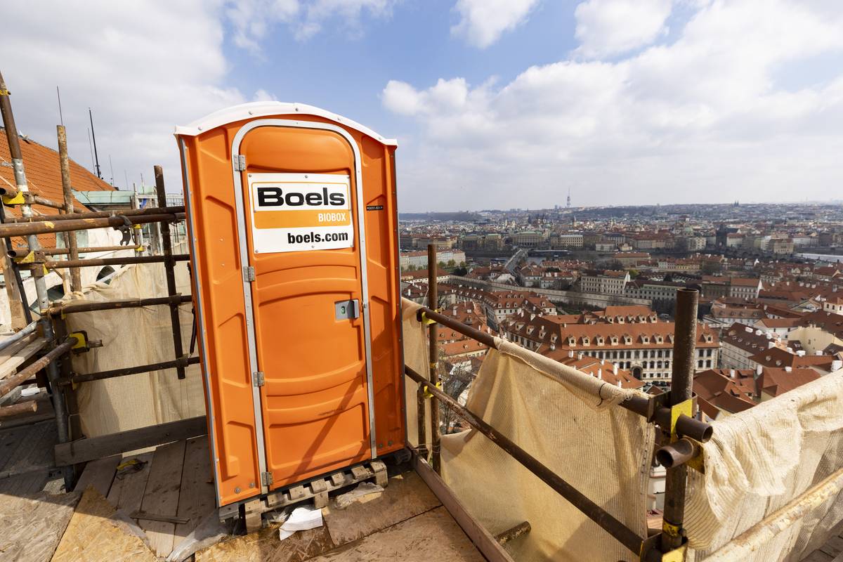 A drobná zajímavost na závěr. V rámci konstrukce lešení je také přenosná toaleta s asi nejhezčím výhledem v Praze.