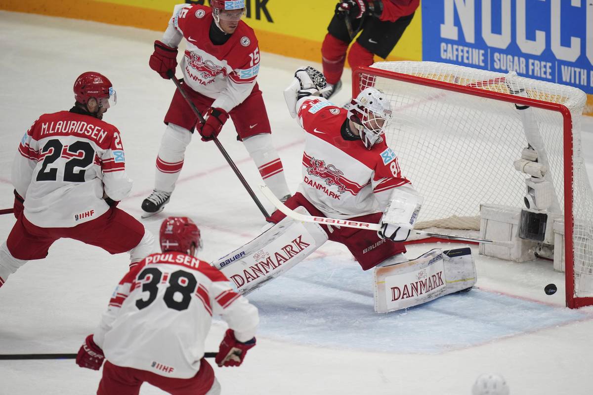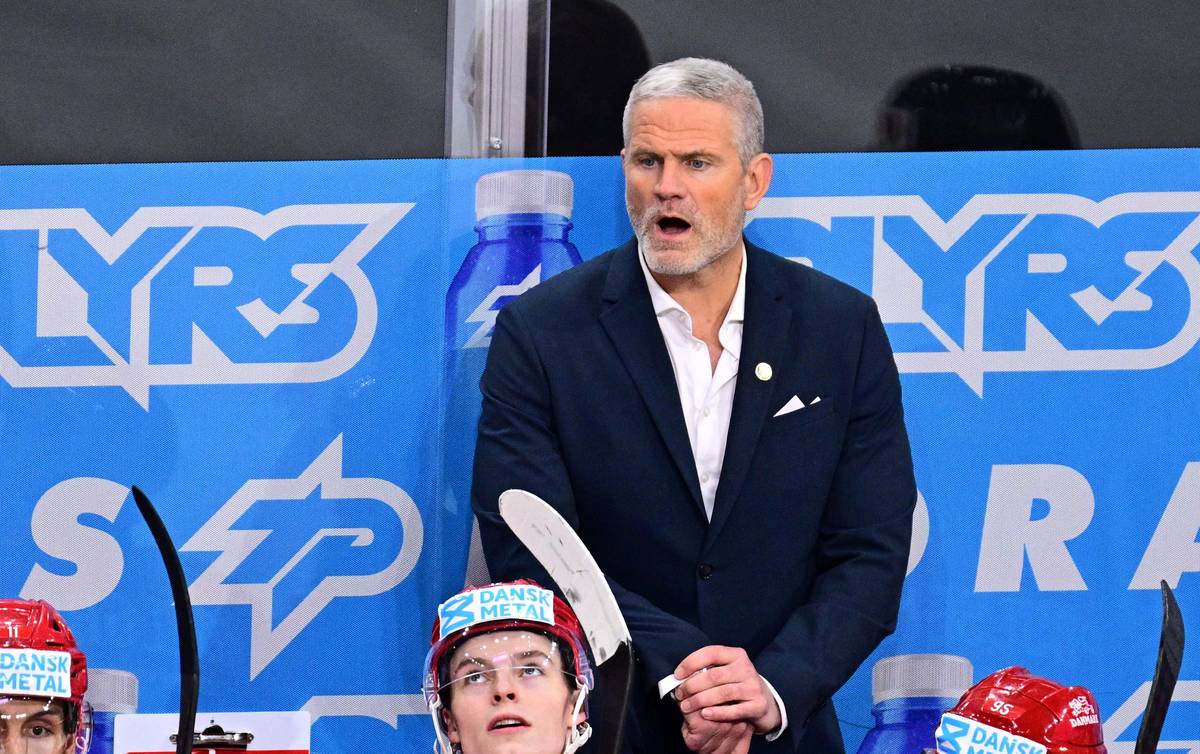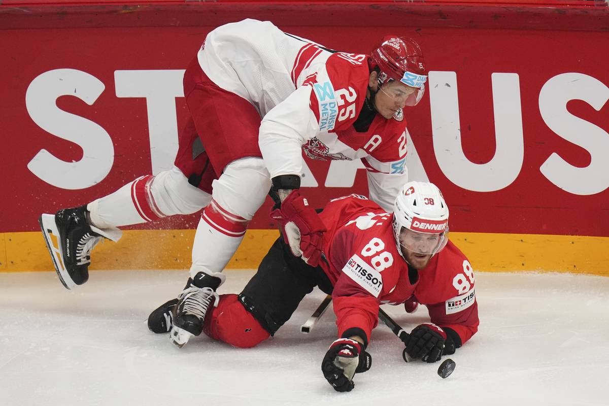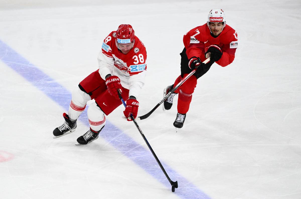 Dánský útočník Morten Poulsen (38) si kryje puk před dotírajícím Kenem Jagerem.