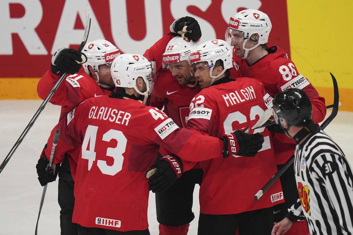 Radost švýcarských útočníků Damiena Riata (9) a Simona Knaka