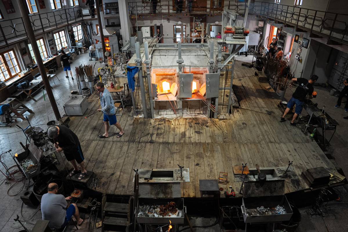 Skláři pracují ve velkém horku z okolních pecí a navíc ještě používají hořáky na dodatečné nažhavení skleněné hmoty pro tvarování.
