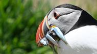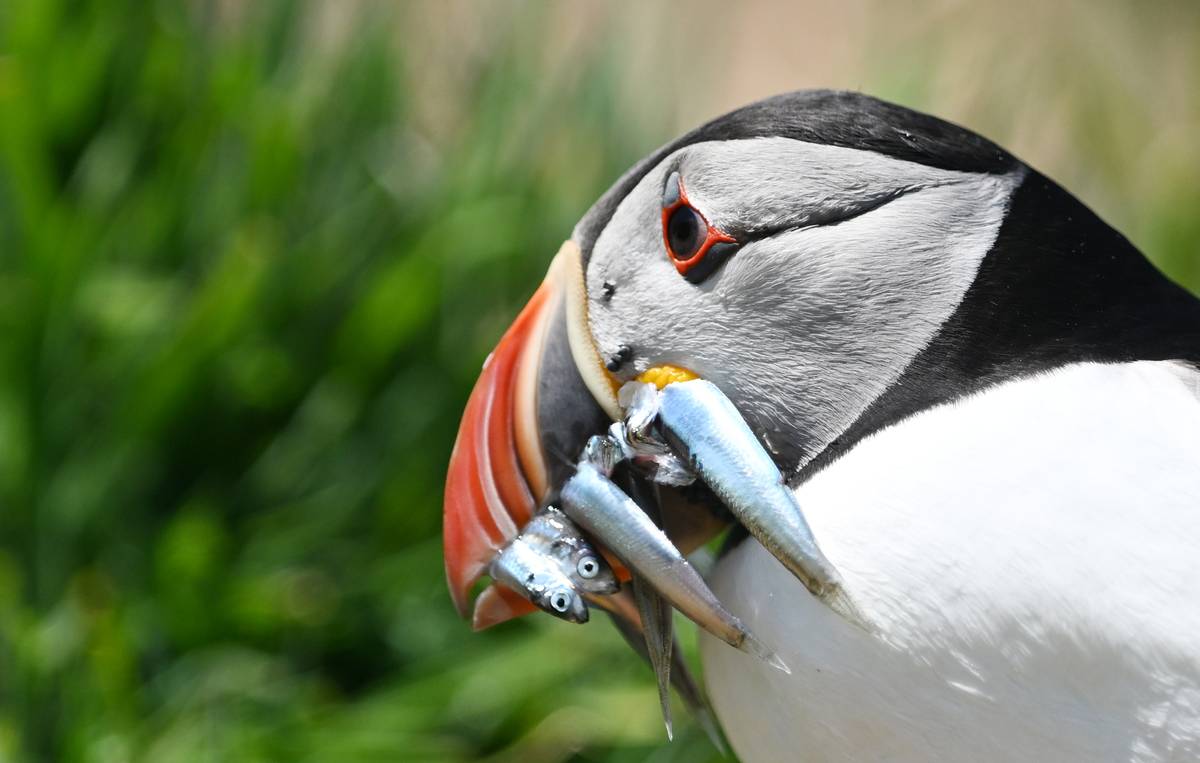 Papuchalk severní drží v zobáku ryby na ostrově Skomer ve Spojeném království. Snímek byl pořízen 22. května 2025 na tomto chráněném území, které je známé svou bohatou ptačí populací.