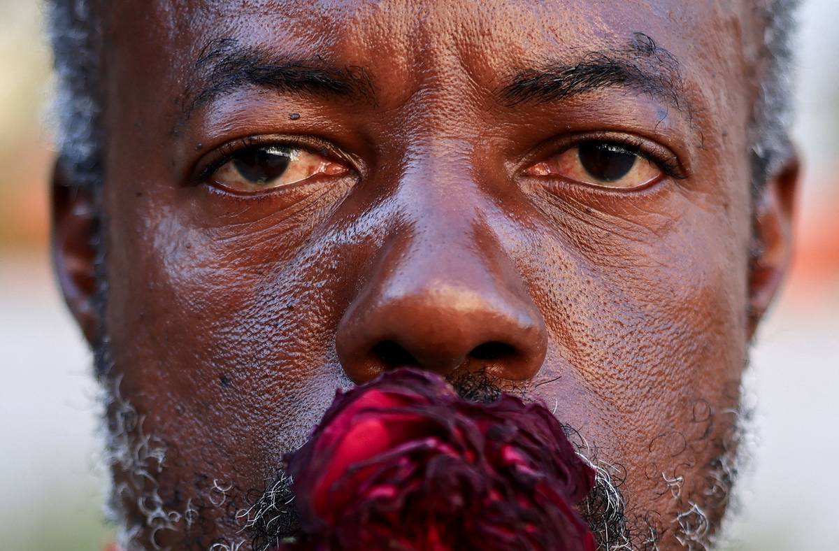 Muž s květinou v ústech pózuje během shromáždění aktivistů a příznivců hnutí Black Lives Matter, kteří si v Los Angeles připomínají páté výročí vraždy George Floyda. Událost z 25. května 2020 stále rezonuje v americké společnosti. (21. května)