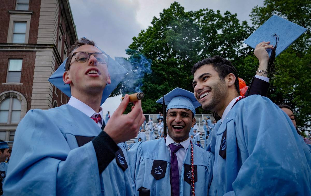 Absolventi slaví během slavnostního zahájení akademického roku na Kolumbijské univerzitě v jejím hlavním kampusu na Manhattanu.