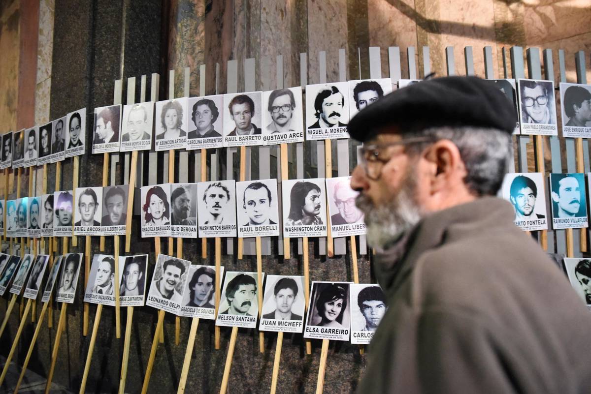 Muž kráčí v uruguayském Montevideu kolem portrétů pohřešovaných z období diktatury mezi lety 1973 a 1985 v rámci 30. ročníku Pochodu mlčení (Marcha del Silencio). (20. května)