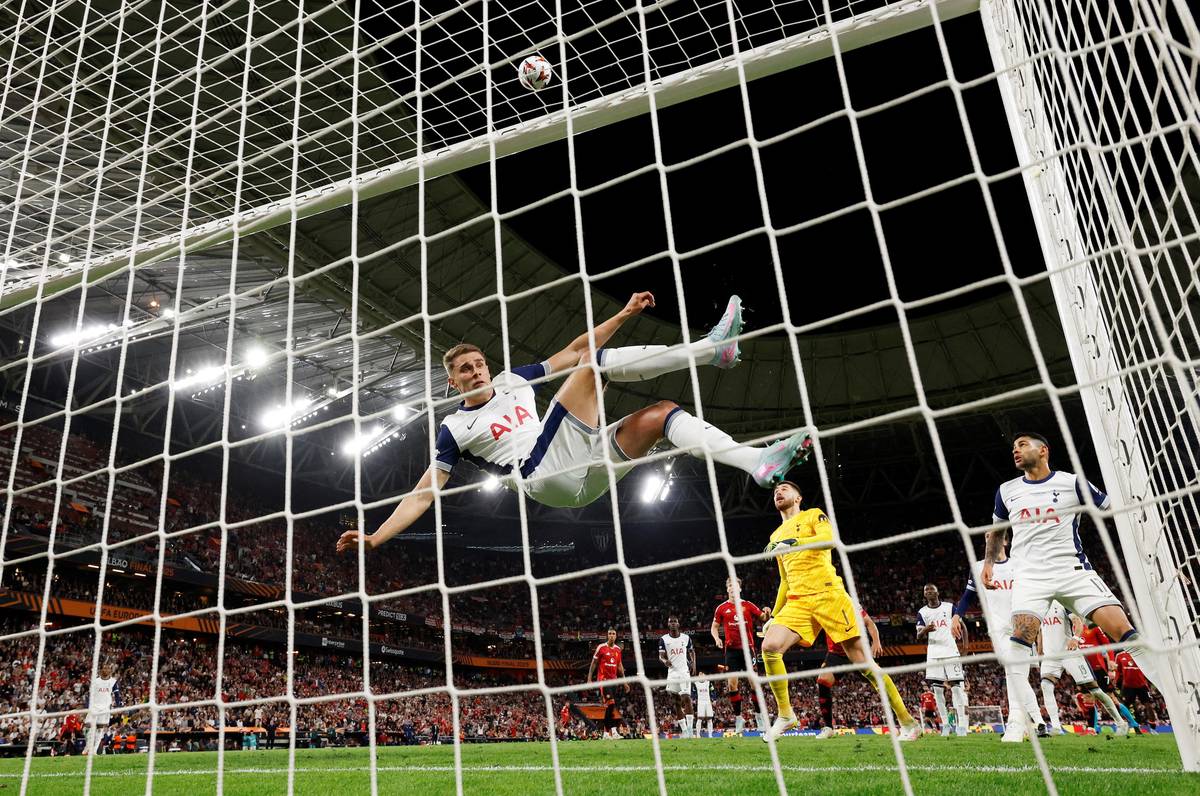 Micky van de Ven z Tottenhamu Hotspur odklízí míč po hlavičce Rasmuse Hojlunda z Manchesteru United. Fotbalisté Tottenhamu porazili ve finále Evropské ligy Manchester United 1:0 a slaví první evropskou trofej od roku 1984, kdy vyhráli předchůdce této soutěže Pohár UEFA.