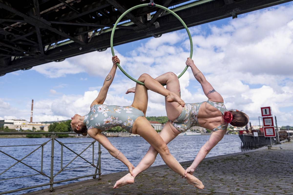 Ukázka skupinové choreografie na aerial kruhu. Trik vyžaduje souhru, důvěru a vzájemnou oporu.