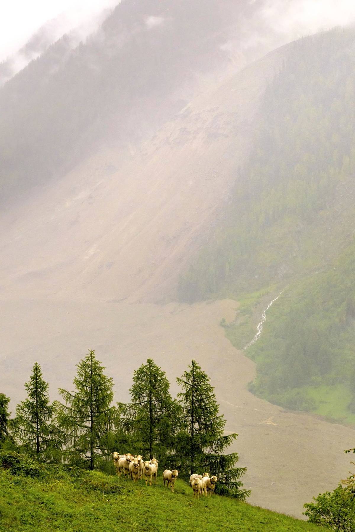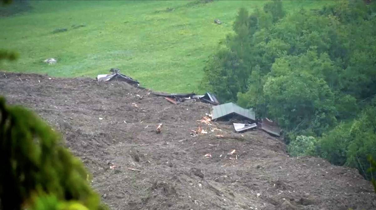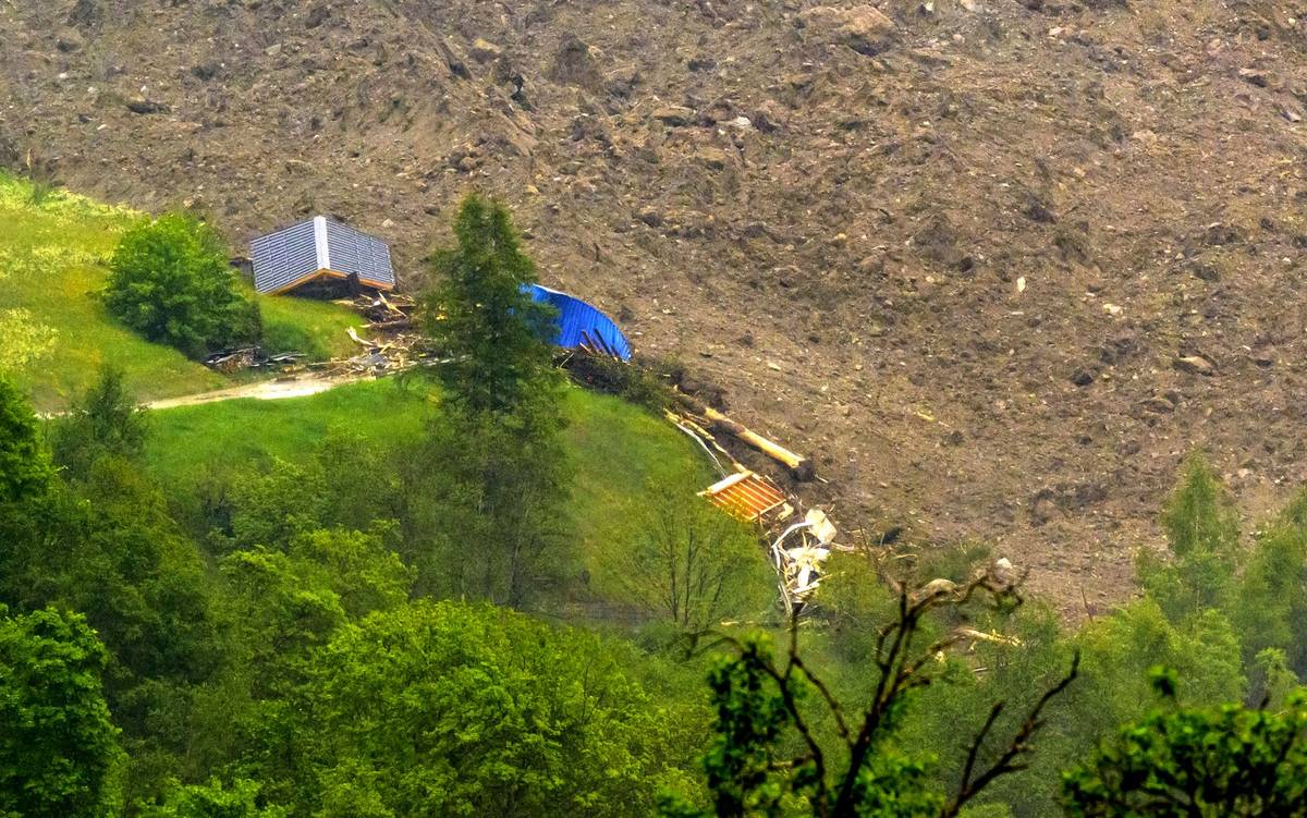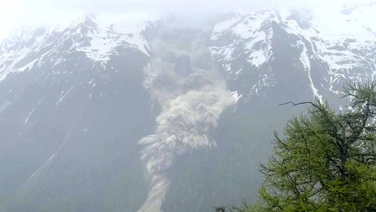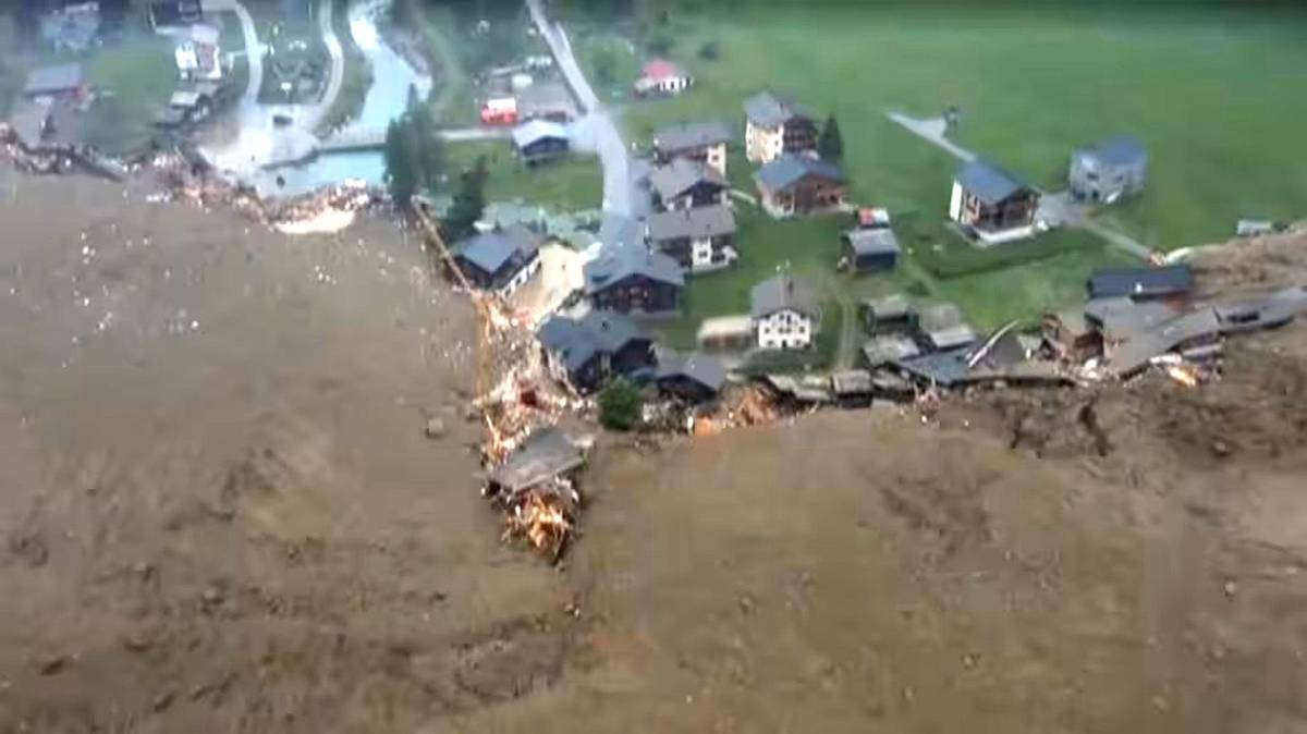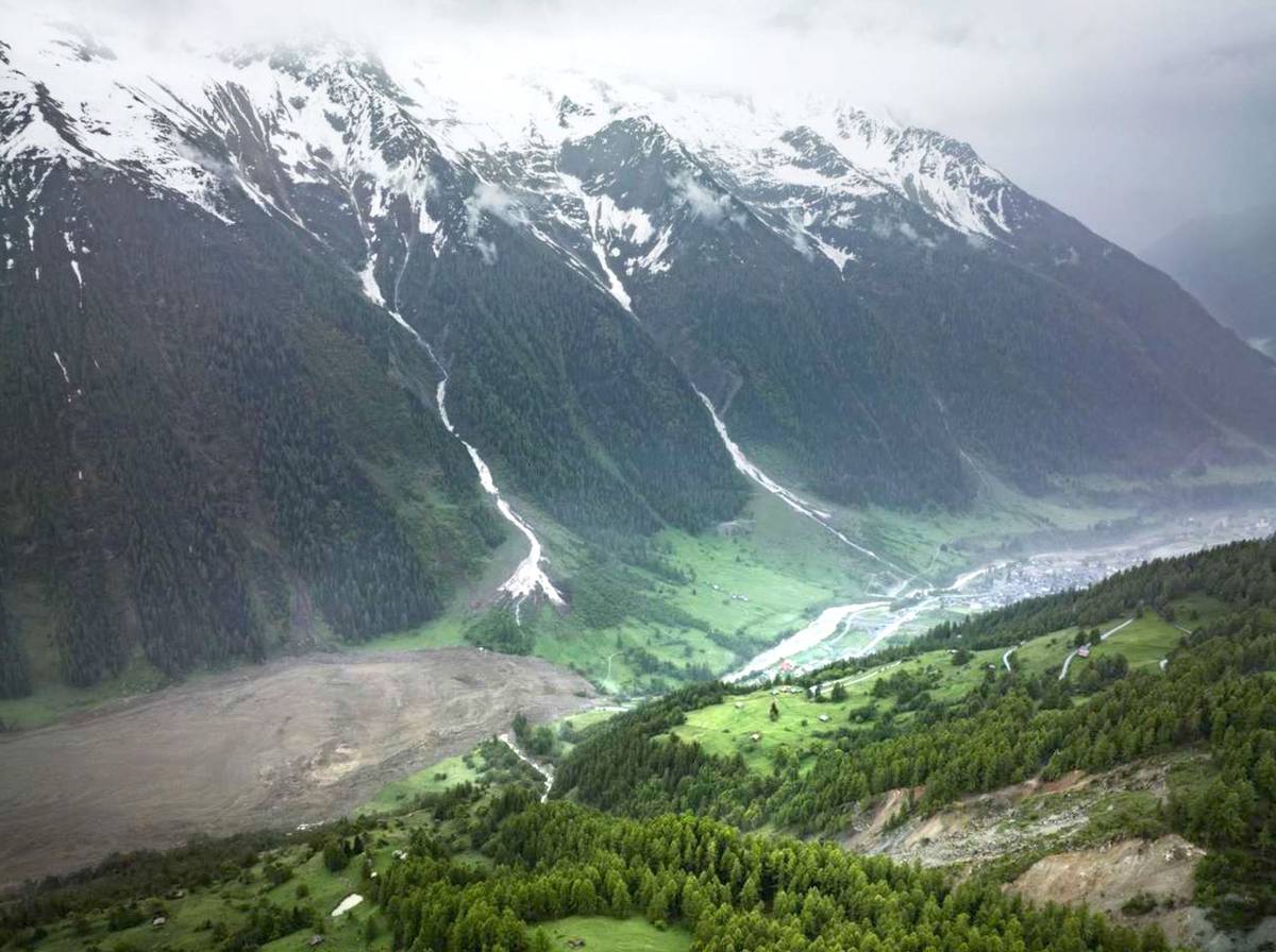 Nad hromadou sutin pokrývající údolí se stále vynořuje jen několik budov. Snímky ukazují obrovský oblak ledu a sutin valící se po horském svahu s výhledem na údolí, kudy protéká řeka Lonza a kde se nachází Blatten.