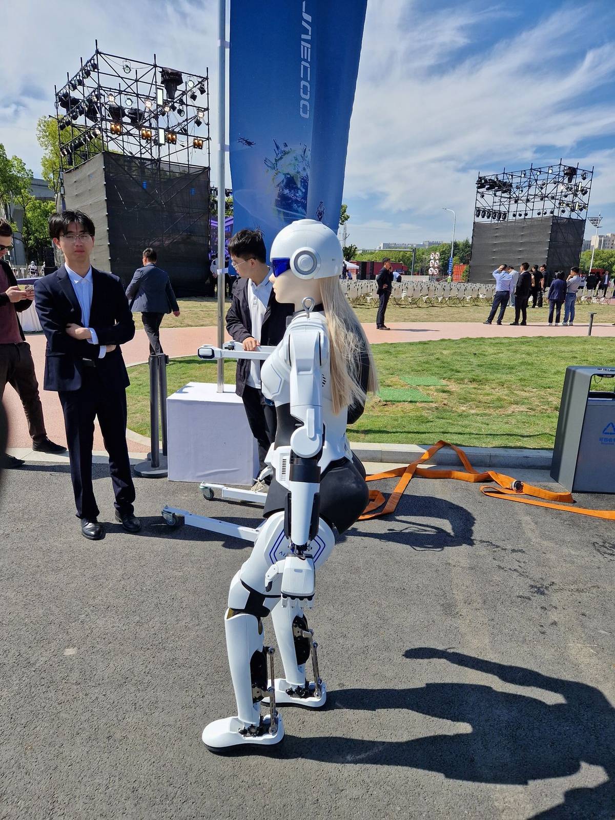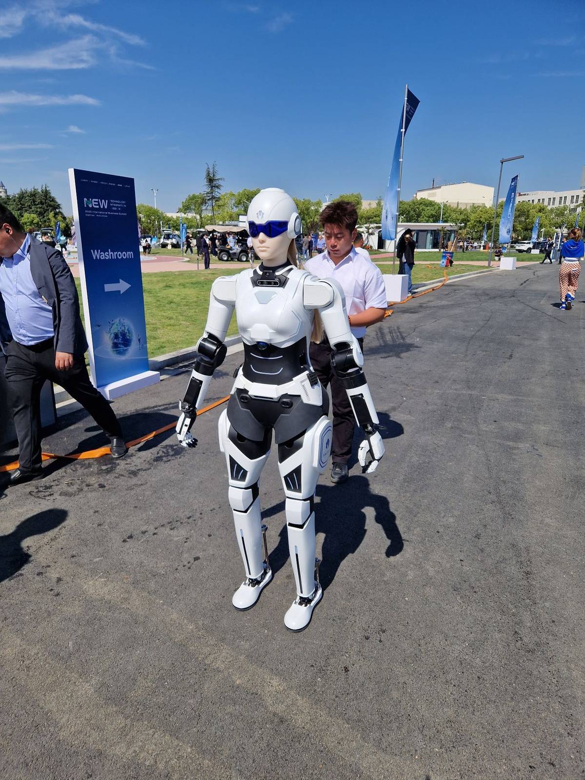 Ostrý kontrast oproti trojici starých aut, humanoidní robot s některými lidskými vizuálními rysy.