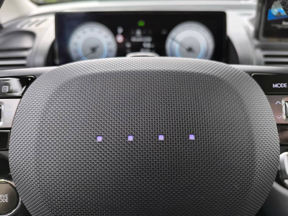 Stav dobití baterie vidí řidič i na volantu. Každá rozsvícená tečka reprezentuje čtvrtinu její kapacity.