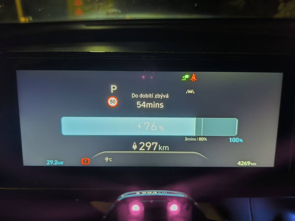 Údaj o rychlosti nabíjení je vlevo dole. Na 50 kW nabíječce nepřesáhl dobíjecí výkon 40 kW.
