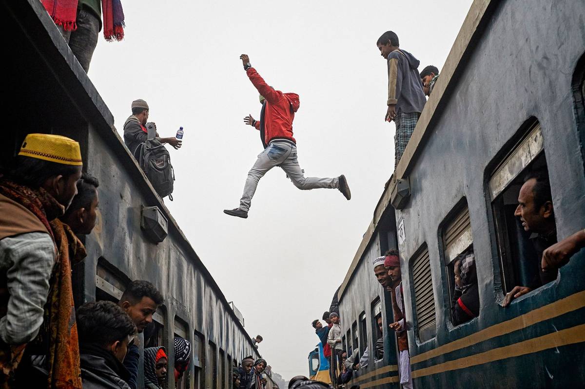 Odvážný snímek s názvem Skákači pochází z Bangladéše a jeho autorem je Josef Bosák. Mládežníci ve stanici v Dháce skáčou z vagonu na vagon.