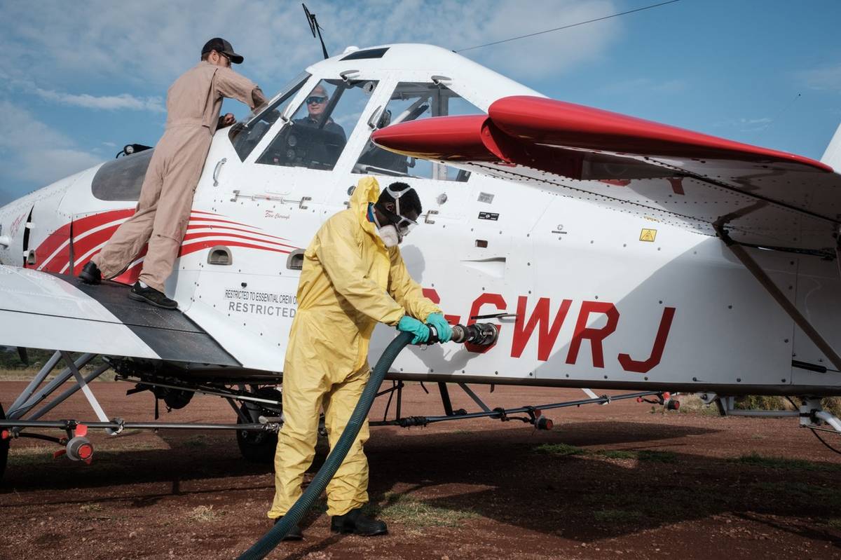 Vyslaný tým letí do cílových oblastí, aby pesticidy zastavil hladový roj kobylek a zachránil živobytí tisíců farmářů.