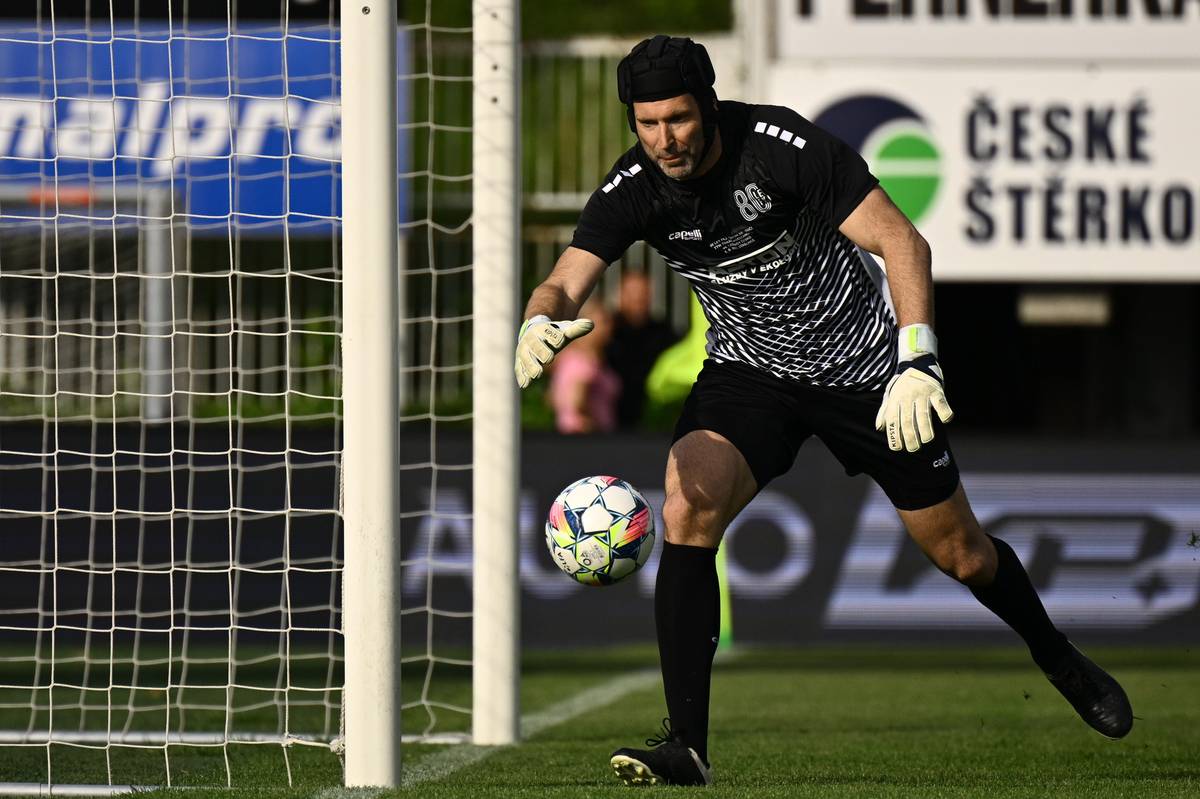 Petr Čech si v Jablonci i zachytal, samozřejmě s helmou.