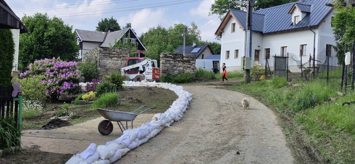 Lidé u svých domů staví zátarasy z pytlů s pískem