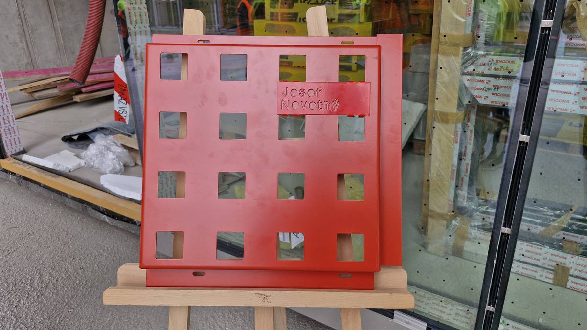 Vzorek hliníkové fasády s ukázkovým štítkem jména dárce.