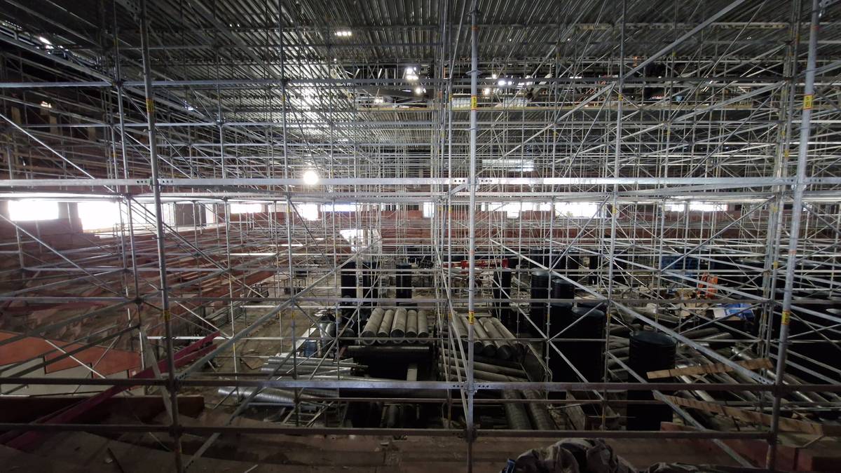 Interiéru arény v posledních týdnech dominuje prostorové lešení využívané při montáži velkých komponentů vzduchotechniky.