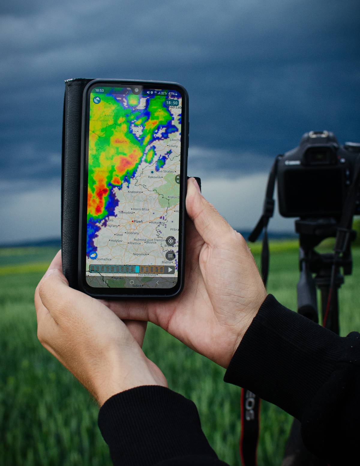 Pravidelně kontrolujeme meteoradar, abychom viděli, jak je bouřka daleko. Na obrazovce můžeme vidět bouřkový pás postupující ze západu Čech směrem na východ.