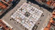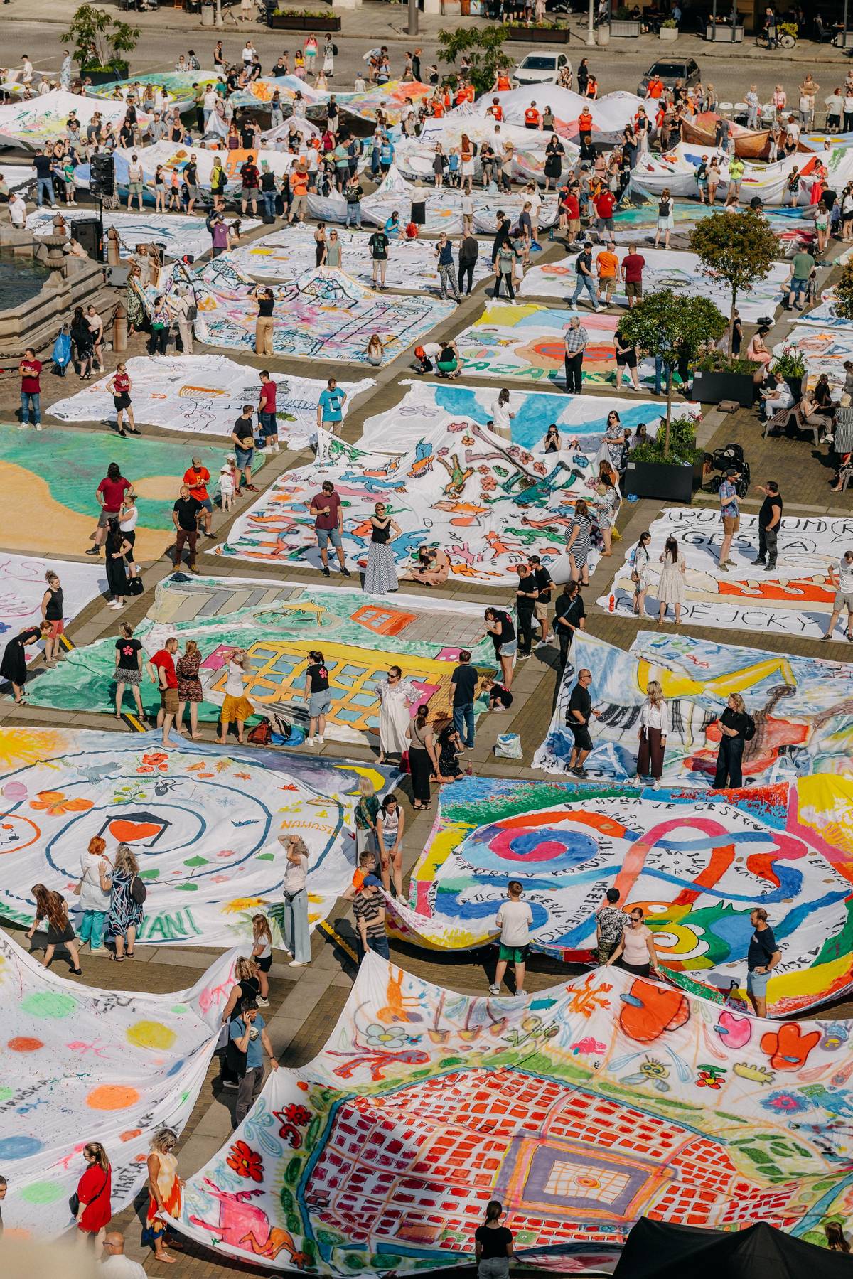Plátna obklopila Samsonovu kašnu uprostřed náměstí a vytvořila obraz rozprostírající se na ploše 6400 metrů čtverečních.