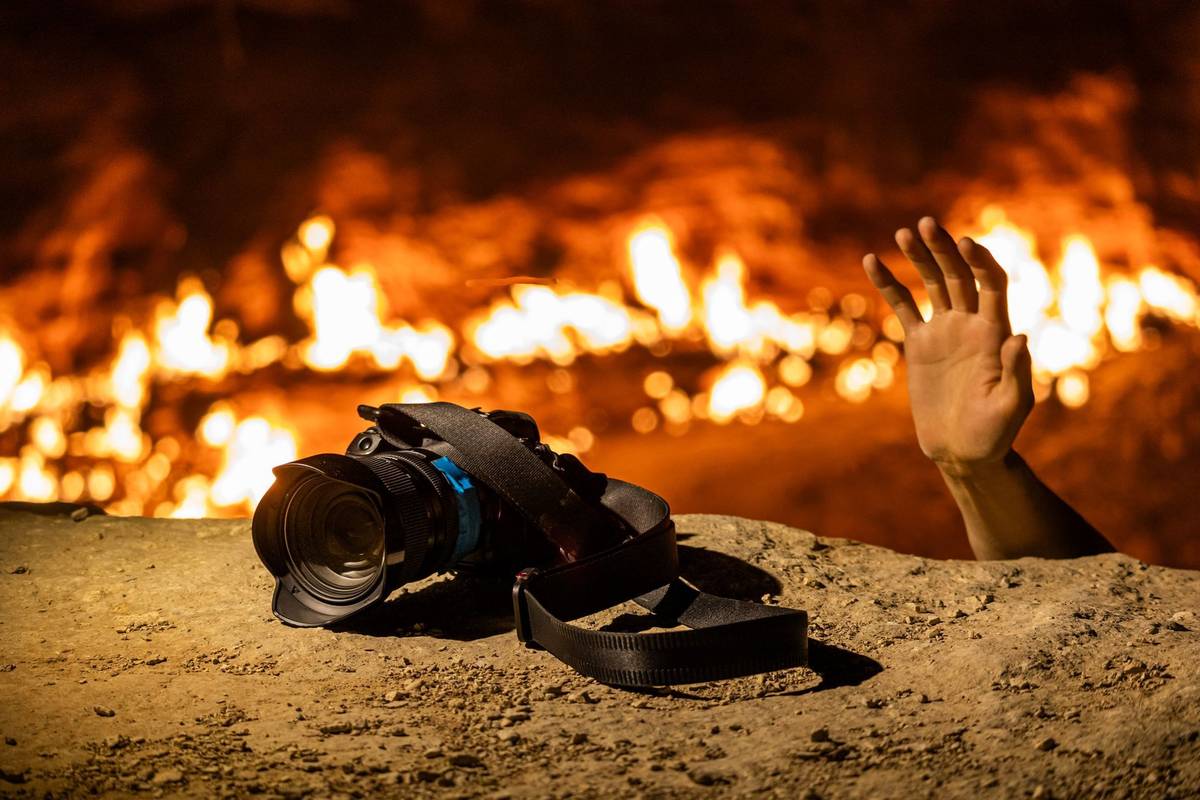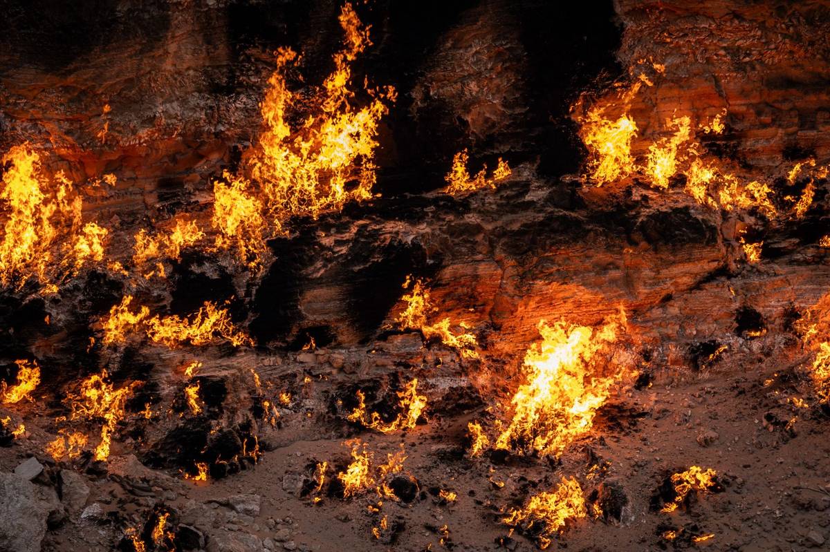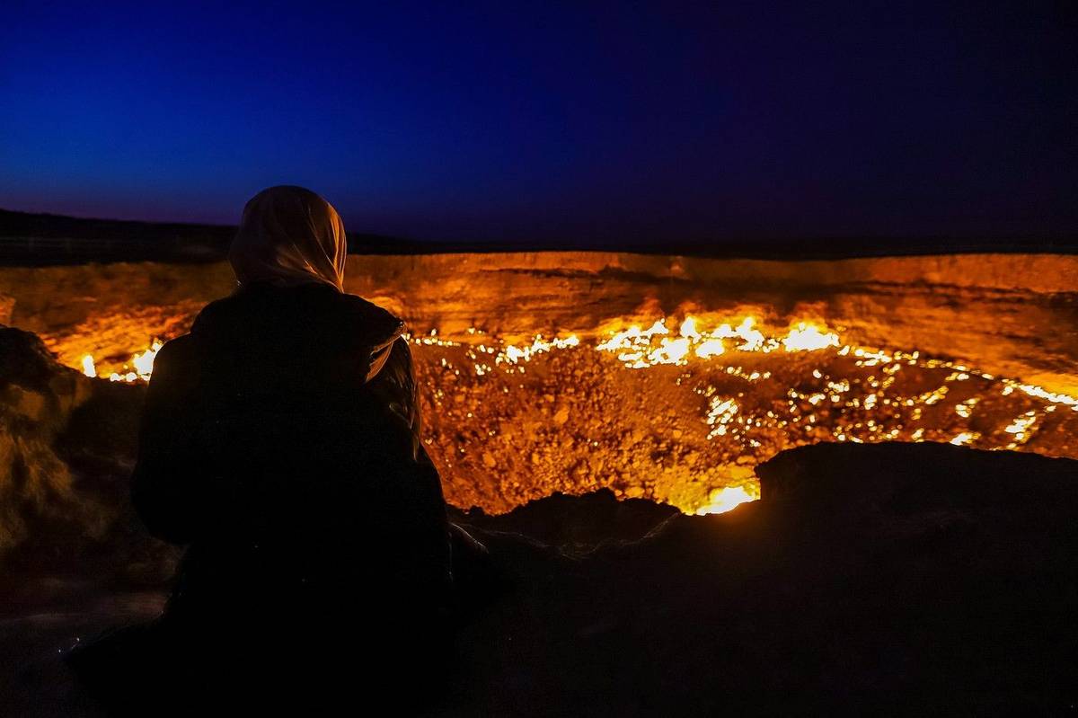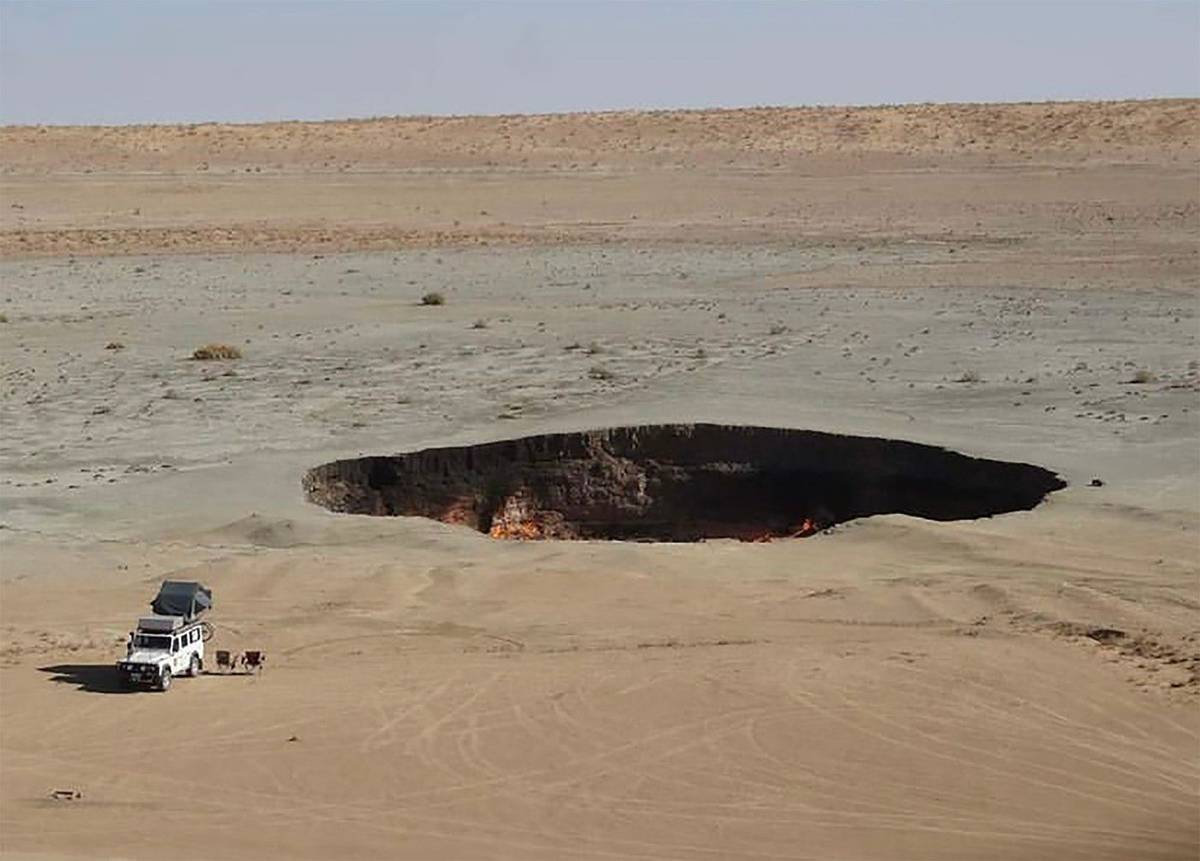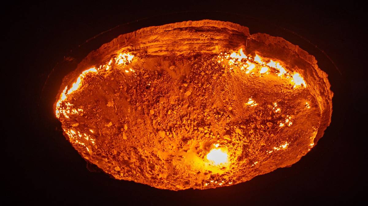 Brána do pekla, plynový kráter Darvaza v turkmenské poušti Karakum, hoří od 70. let po nehodě při vrtání, kdy sovětští geologové zapálili unikající metan.