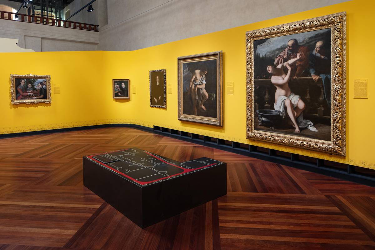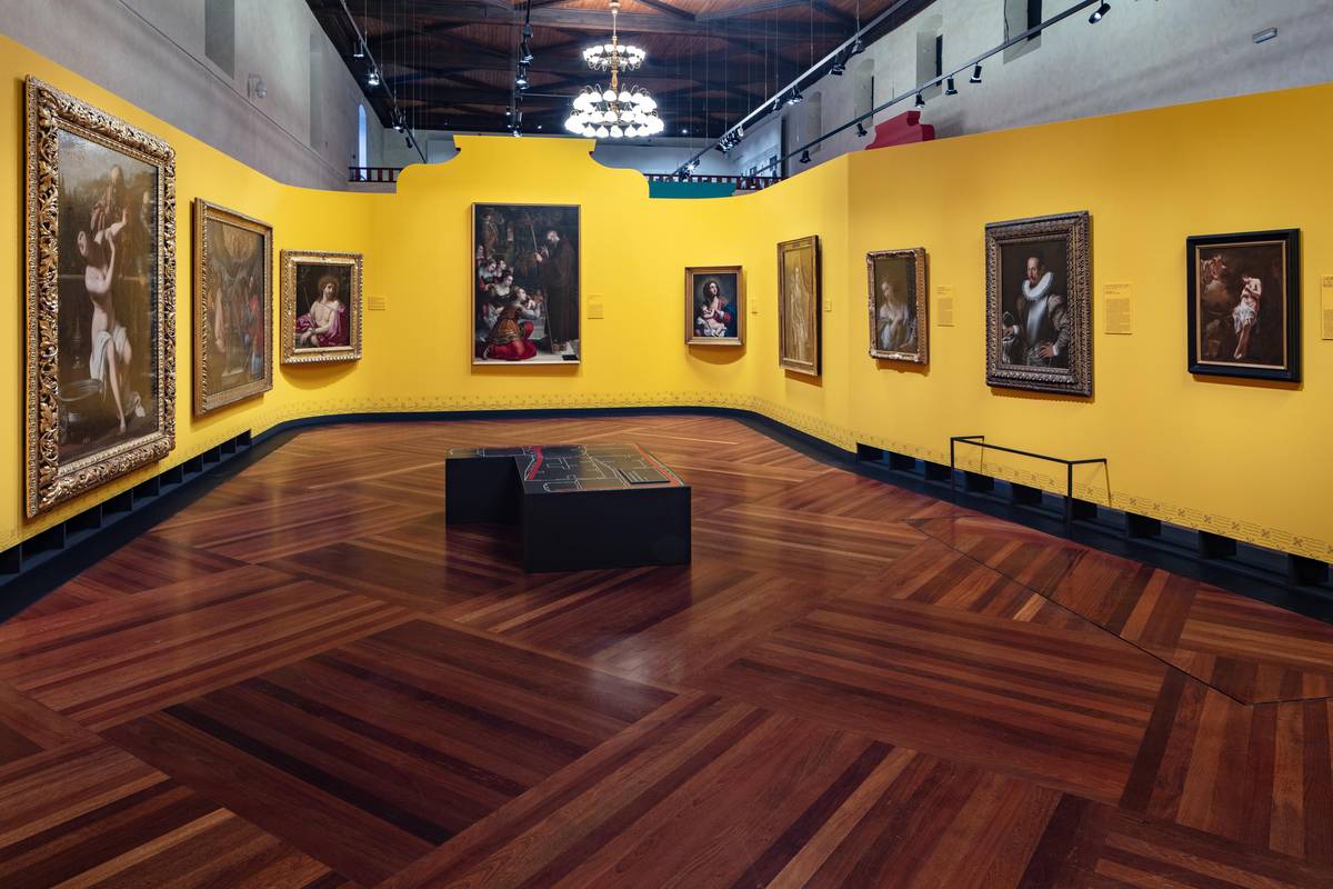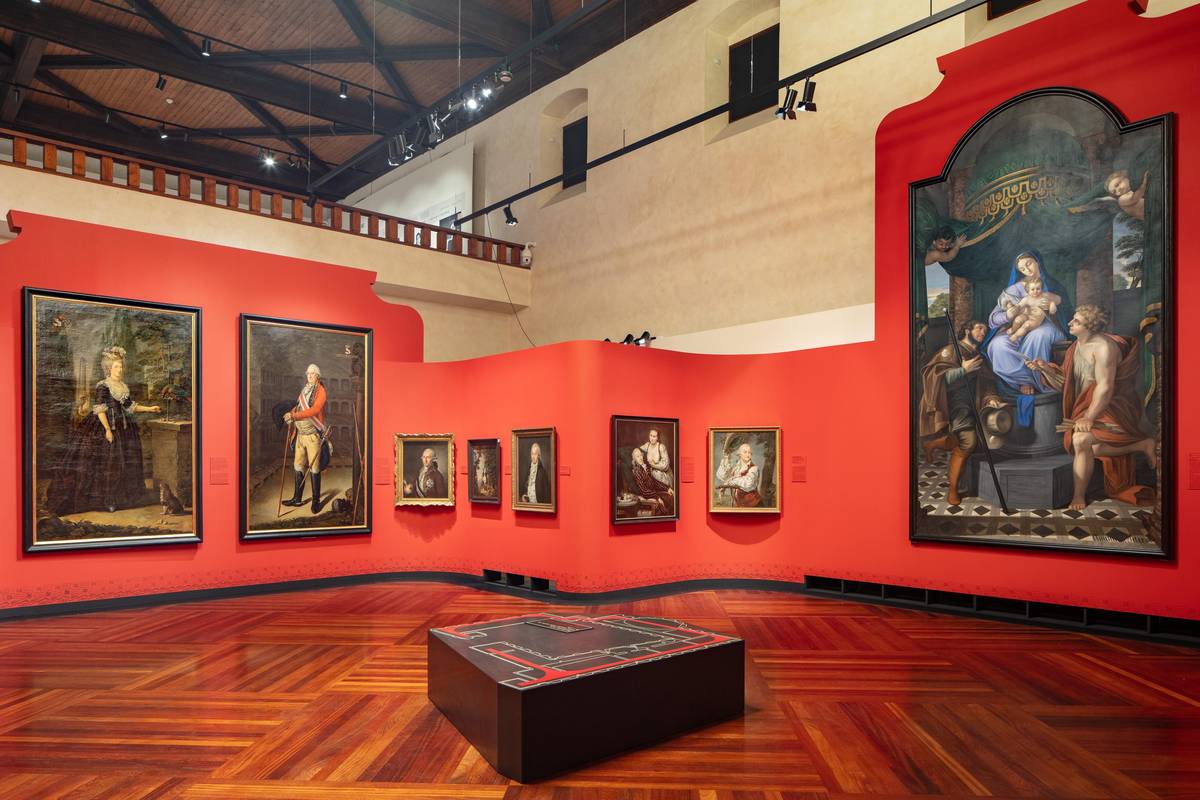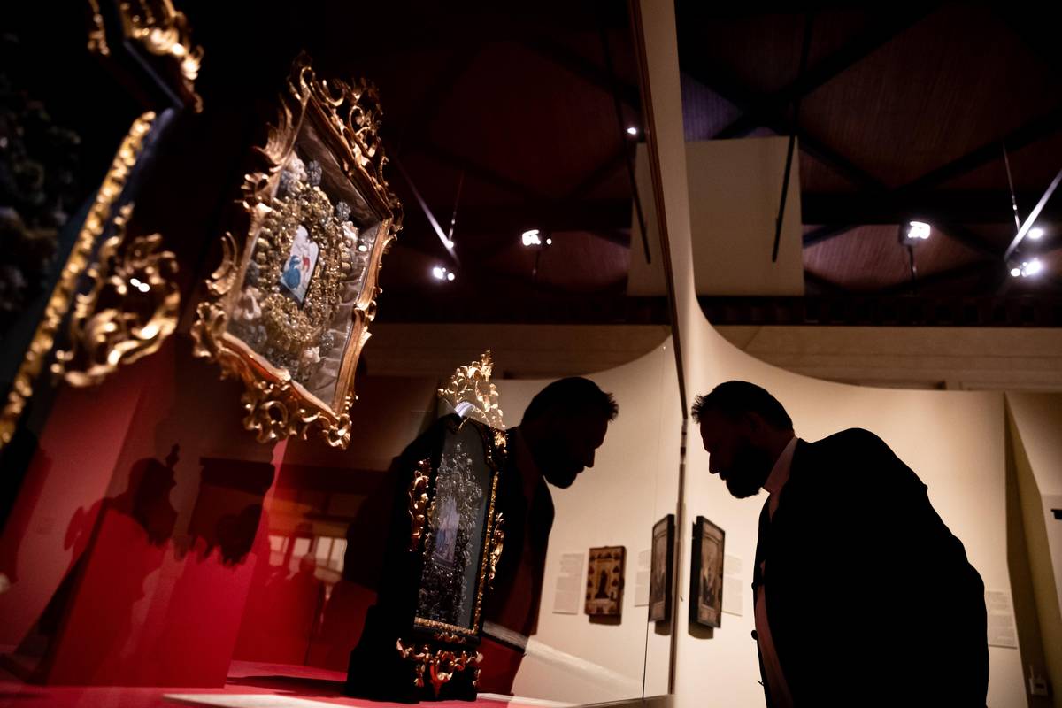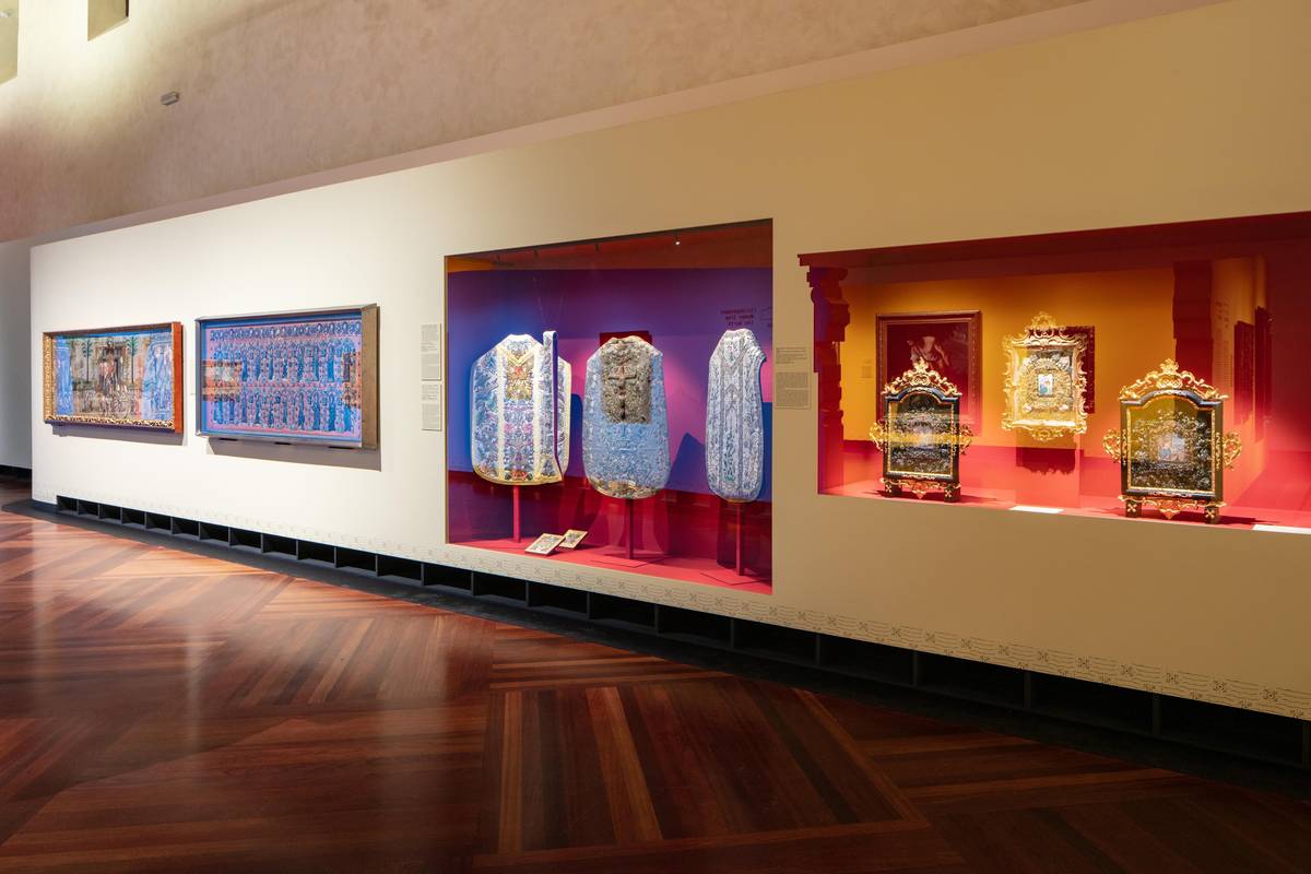 Na fotografii z výstavy Ženy, mistryně, umělkyně 1300 - 1900, která v pražské Valdštejnské jízdárně potrvá do 2. listopadu, je uprostřed oltářní obraz od německé malířky Amalie von Peter znázorňující Pannu Marii se sv. Rochem a sv. Šebestiánem z kostela Nalezení sv. Kříže v Litomyšli z roku 1842.