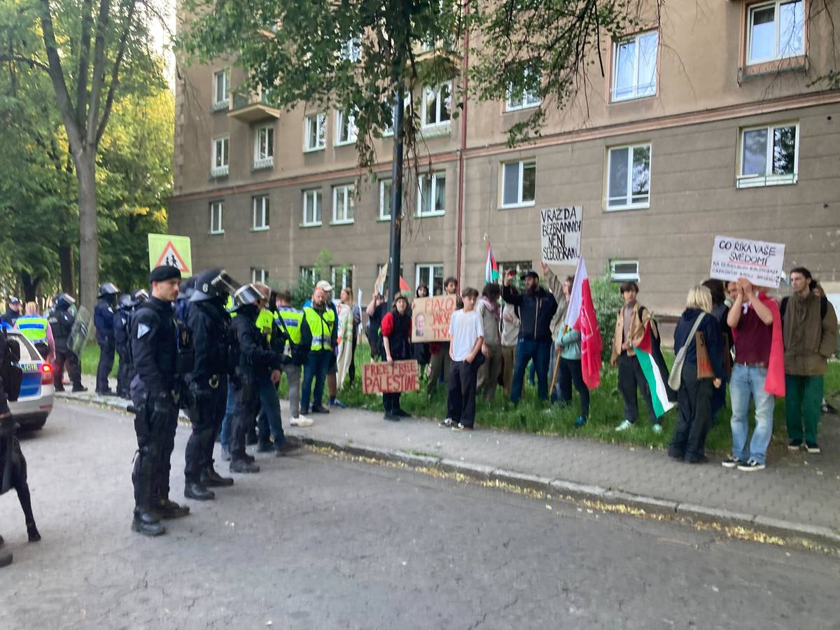 Propalestinští demonstranti po debatě Petra Fialy v Ostravě.