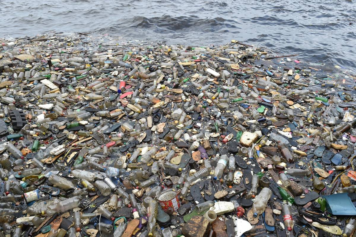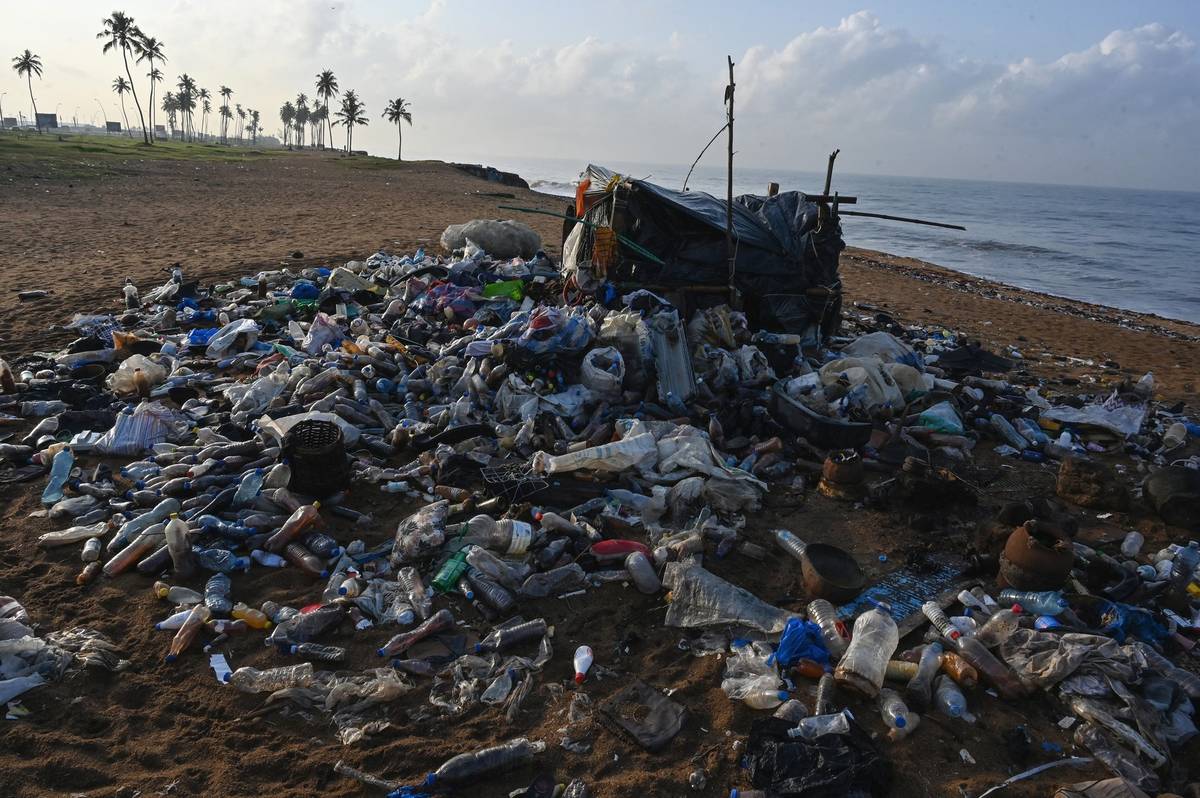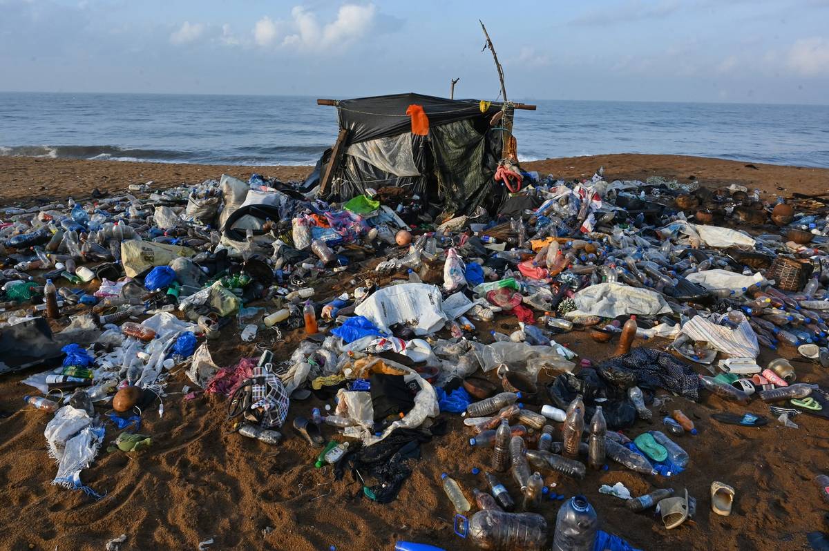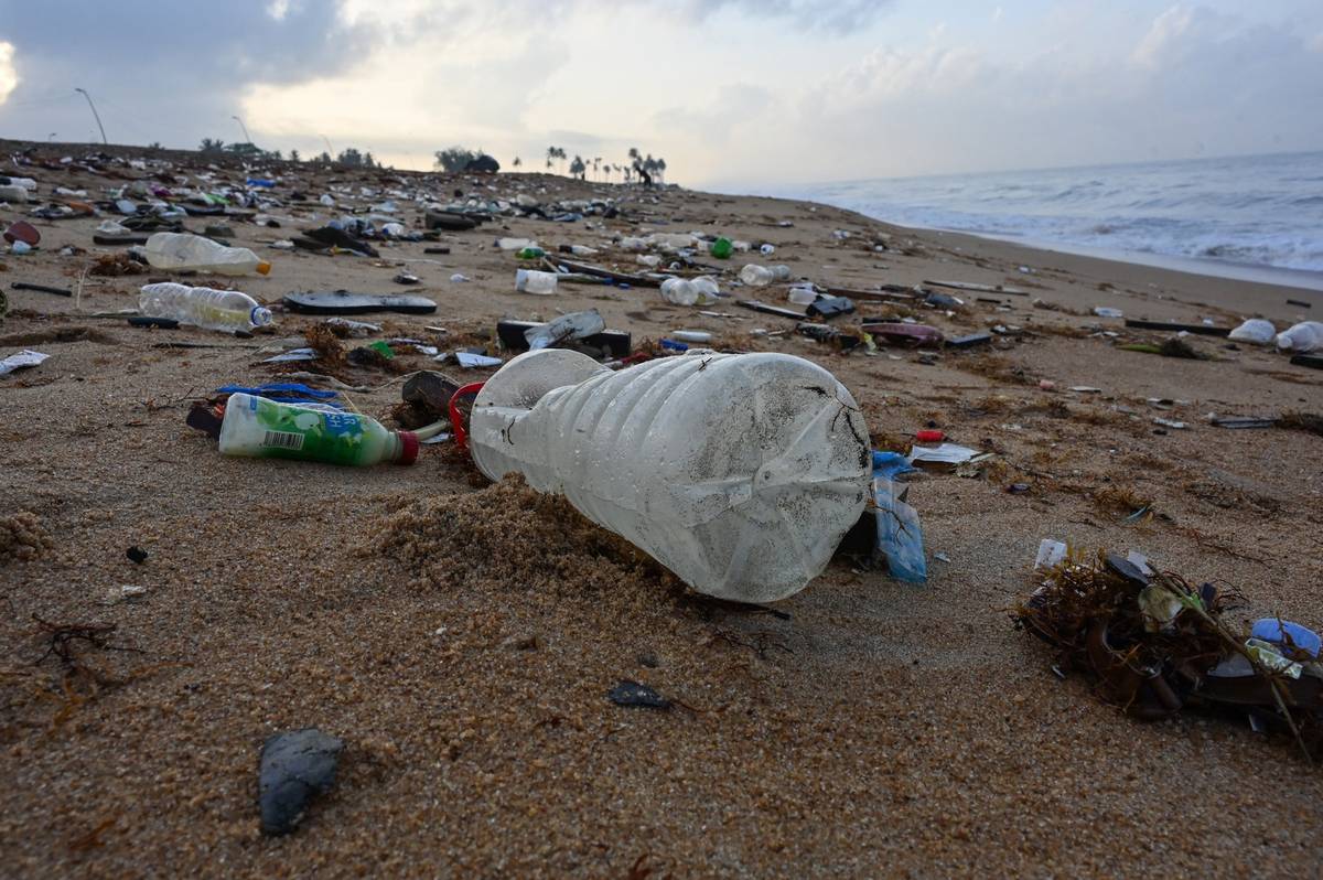 Na pláži se povalují odhozené plastové lahve, obaly a další nepořádek.