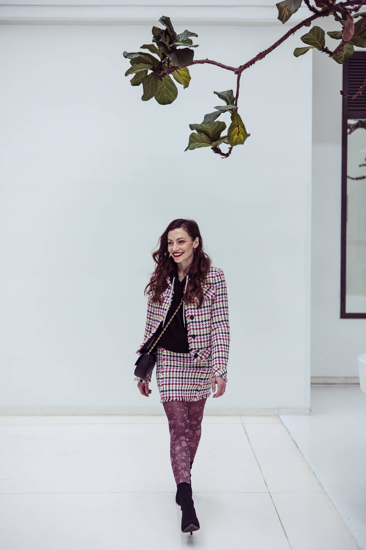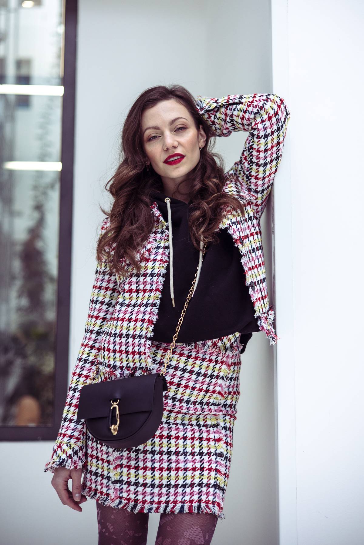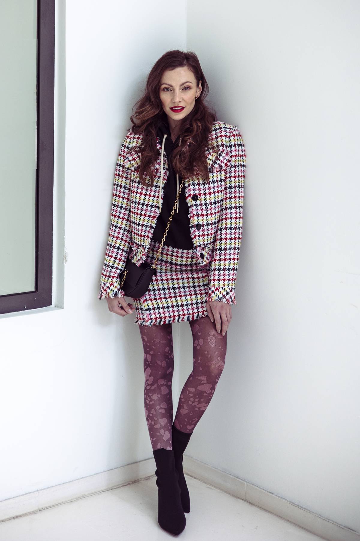 Na foto: náušnice (Topshop, prodává Zalando, 490 Kč za set); sako (Karl Lagerfeld, prodává Vermont, 8399 Kč); mikina (F&F, 349 Kč); sukně (Karl Lagerfeld, prodává Vermont, 5809 Kč); kabelka (Zac Posen, prodává Zalando, 3444 Kč); punčocháče (Hysteria, prodává Urbanlux, 699 Kč); boty (F&F, 699 Kč)