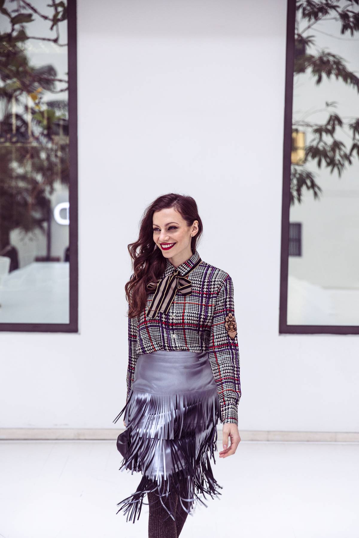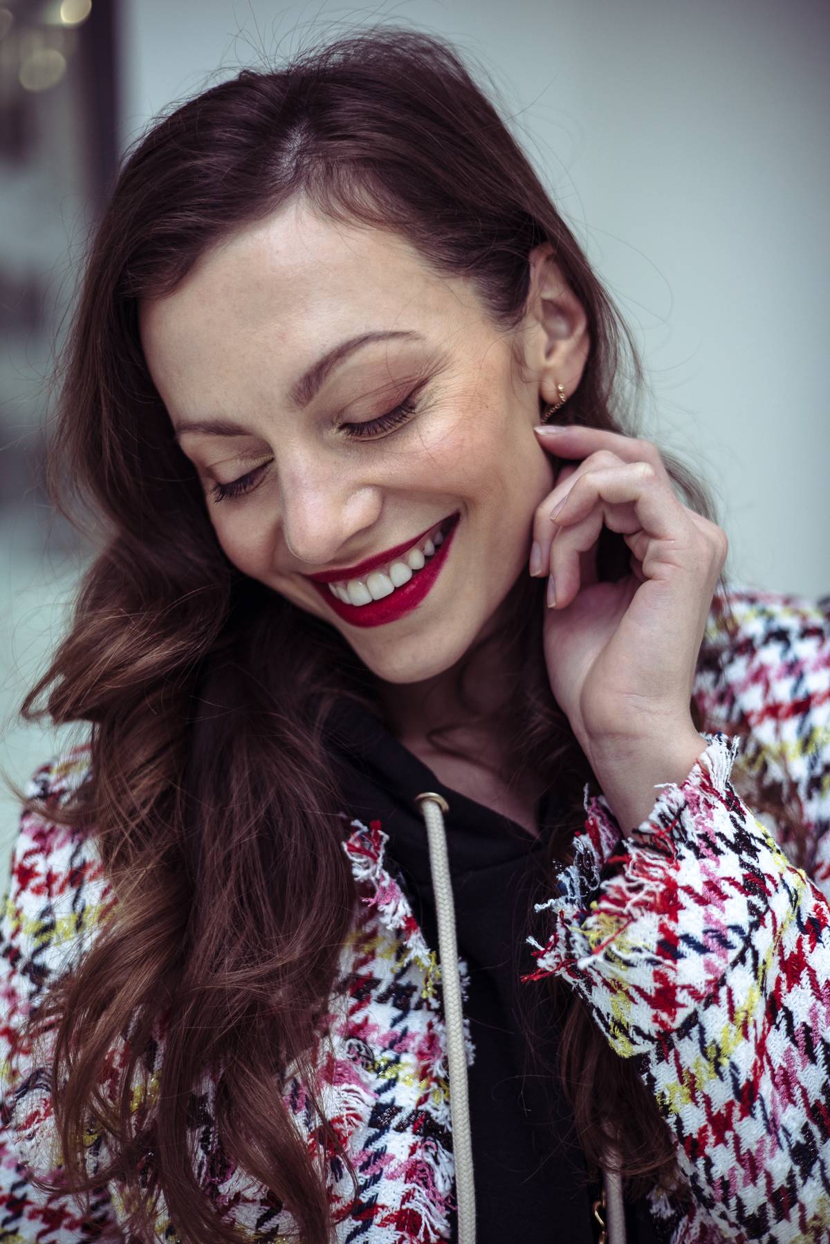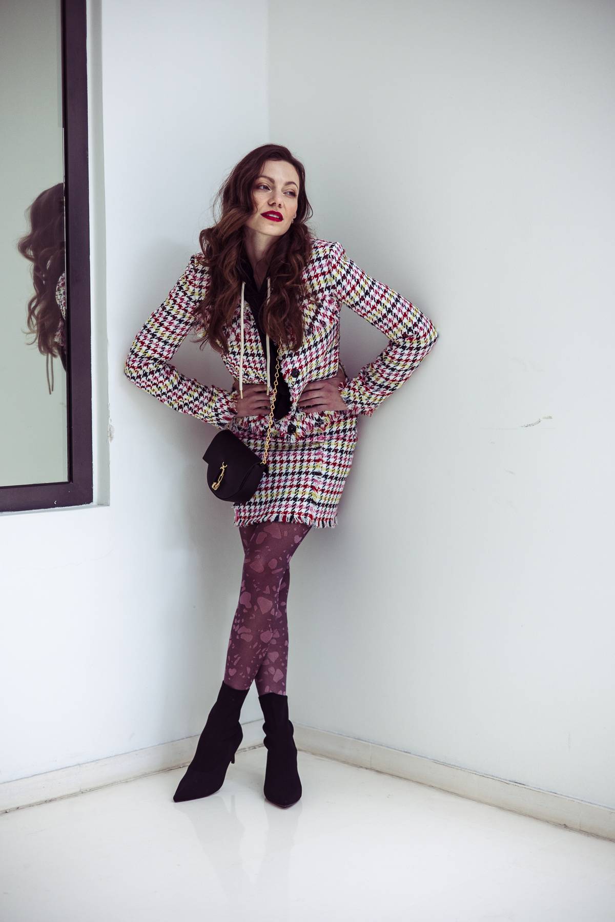 Na foto: náušnice (Topshop, prodává Zalando, 490 Kč za set); sako (Karl Lagerfeld, prodává Vermont, 8399 Kč); mikina (F&F, 349 Kč); sukně (Karl Lagerfeld, prodává Vermont, 5809 Kč); kabelka (Zac Posen, prodává Zalando, 3444 Kč); punčocháče (Hysteria, prodává Urbanlux, 699 Kč); boty (F&F, 699 Kč)
